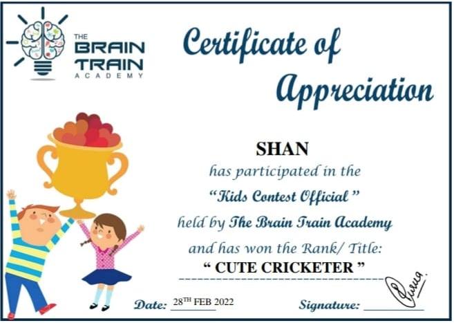 മധ്യപ്രദേശിലുള്ള ബ്രെയിൻ ട്രൈയിൻ അക്കാദമിയുടെ ആഭിമുഖ്യത്തിൽ ഓൺലൈനായി നടത്തിയ ഓൾ ഇന്ത്യ ക്യൂട്ടസ്റ്റ് കിഡ്സ് കോൺടെസ്റ്റിൽ പങ്കെടുത്ത മൂന്നര വയസുള്ള ഷാൻ ജോസ് റിജോയ്ക്ക് ക്യൂട്ട് ക്രിക്കറ്റർ പ്രൈസ് ലഭിച്ചു. പട്ടിക്കാട് തമ്പുരാട്ടിപറമ്പ് തട്ടിൽ റിജോയുടെയും ബിമിയുടെയും മൂത്ത മകനാണ്. ഇതേ കോൺടെസ്റ്റിൽ പങ്കെടുത്ത ഇവരുടെ 5 മാസം പ്രായമായ മകൾ അഹാന റീന റിജോയ്ക്ക് ബ്യൂട്ടിഫുൾ ഐസിനുള്ള പ്രൈസും ലഭിച്ചു. സർട്ടിഫിക്കറ്റും ഉം ക്യാഷ് അവാർഡും അടങ്ങുന്നതായിരുന്നു പ്രൈസ്.
