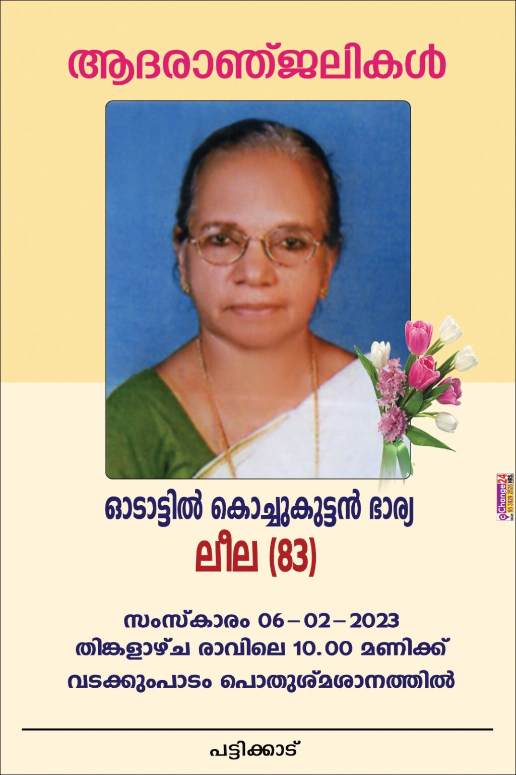 കണ്ണാറ ഓടാട്ടിൽ കൊച്ചുകുട്ടൻ ഭാര്യ ലീല (83) അന്തരിച്ചു. സംസ്കാരം ഇന്ന് (06-02-2023) രാവിലെ 10ന് വടക്കുംപാടം ആത്മാലയം ശ്മശാനത്തിൽ.