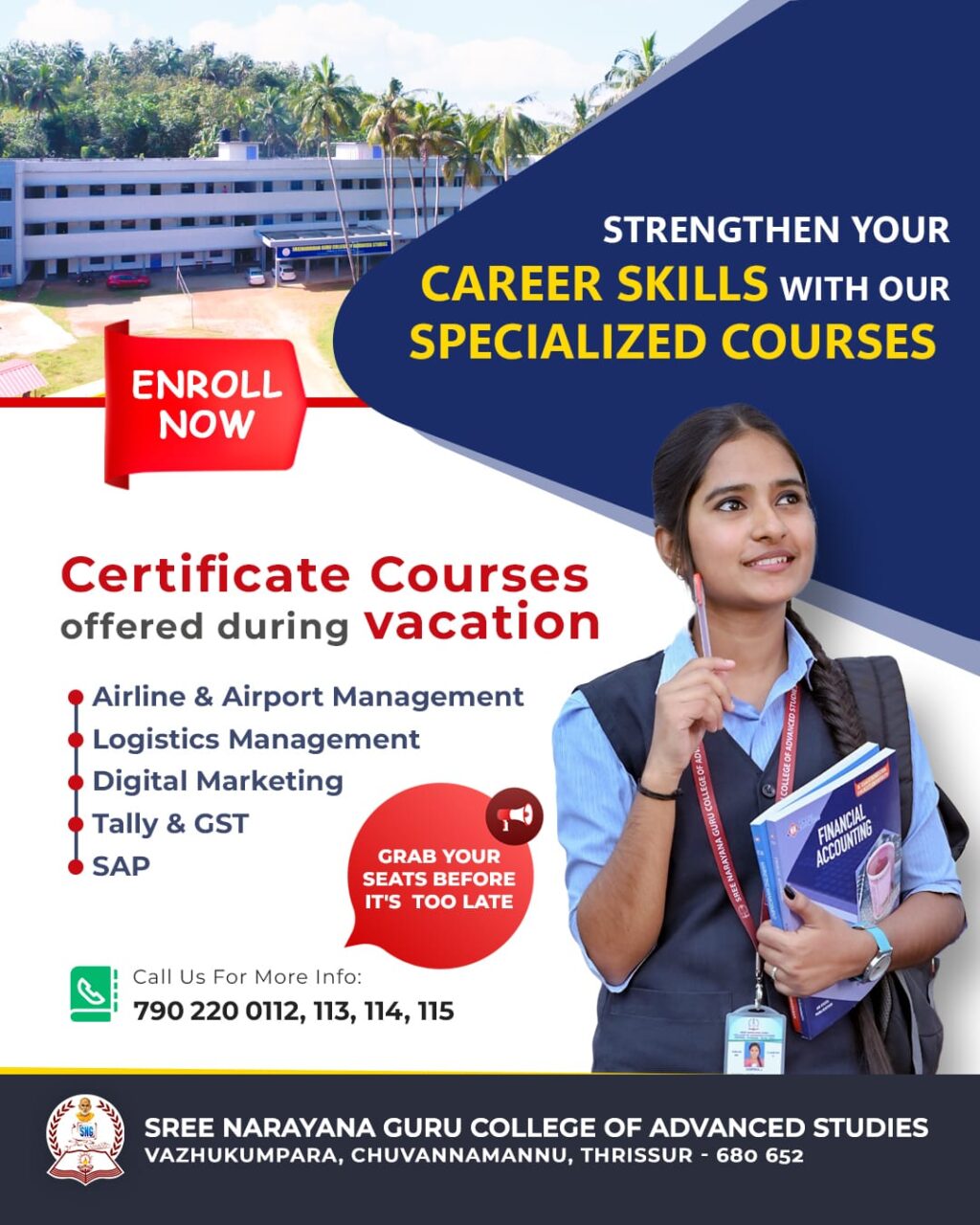 ശ്രീനാരായണ ഗുരു കോളേജ് ഓഫ് അഡ്വാൻസ് സ്റ്റഡീസ് വഴുക്കുംപാറയുടെ ആഭിമുഖ്യത്തിൽ പ്ലസ് ടു, കോളേജ് വിദ്യാർത്ഥികൾക്കായി കുറഞ്ഞ ഫീസ് നിരക്കിൽ പഠിക്കാവുന്ന തൊഴിലധിഷ്ഠിത സർട്ടിഫിക്കറ്റ് കോഴ്സുകൾ ആരംഭിക്കുന്നു. എയർലൈൻ ആൻഡ് എയർപോർട്ട് മാനേജ്മെൻറ്, ഡിജിറ്റൽ മാർക്കറ്റിംഗ്, ലോജിസ്റ്റിക് മാനേജ്മെൻറ്, സാപ്പ്, ടാലി, ജി എസ് ടി തുടങ്ങിയ കോഴ്സുകൾ ആണ് ഏപ്രിൽ ആദ്യവാരത്തിൽ ആരംഭിക്കുന്നത്. തൊഴിലധിഷ്ഠിത സമൂഹത്തെ കെട്ടിപ്പടുക്കുക എന്ന ഉദ്ദേശത്തോടുകൂടി നടത്തുന്ന ഈ കോഴ്സുകളുടെ കാലാവധി രണ്ടുമാസമാണ്. താല്പര്യമുള്ളവർ താഴെ കാണുന്ന ഫോൺ നമ്പറിലോ നേരിട്ടോ ഓഫീസുമായി ബന്ധപ്പെടേണ്ടതാണ്.
