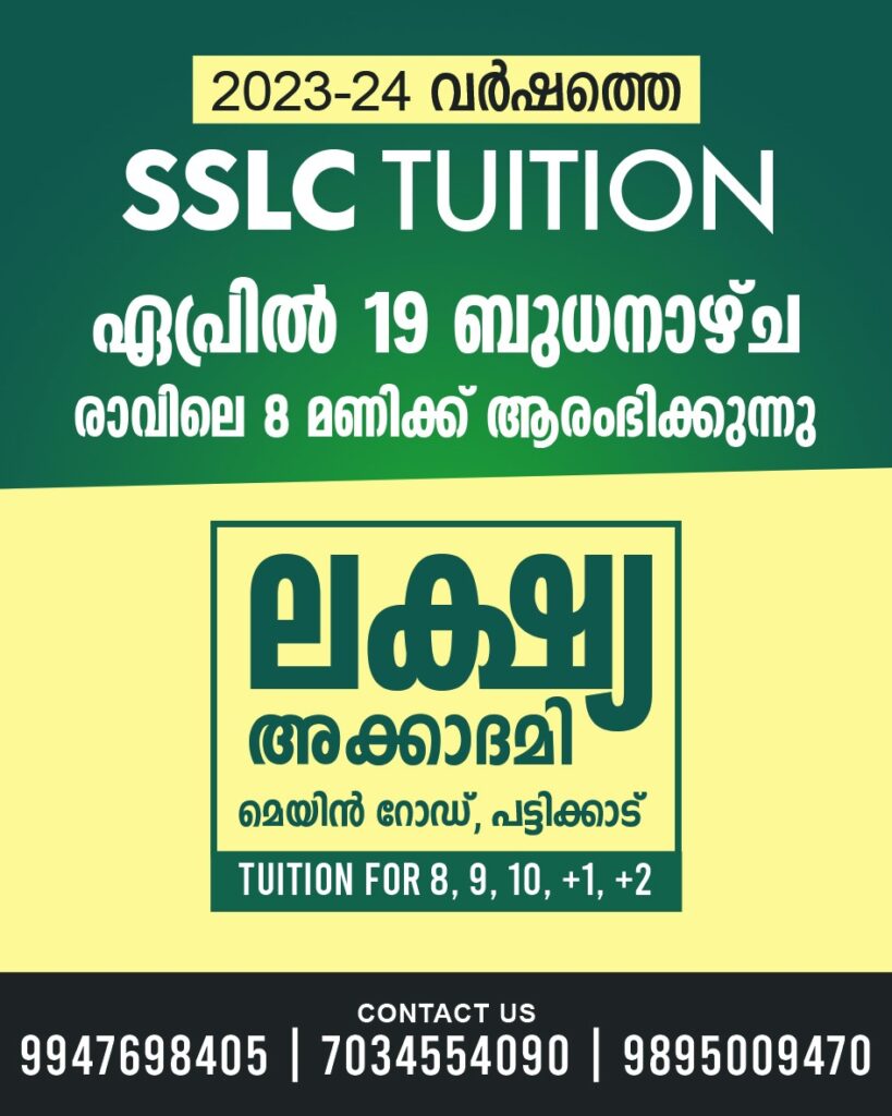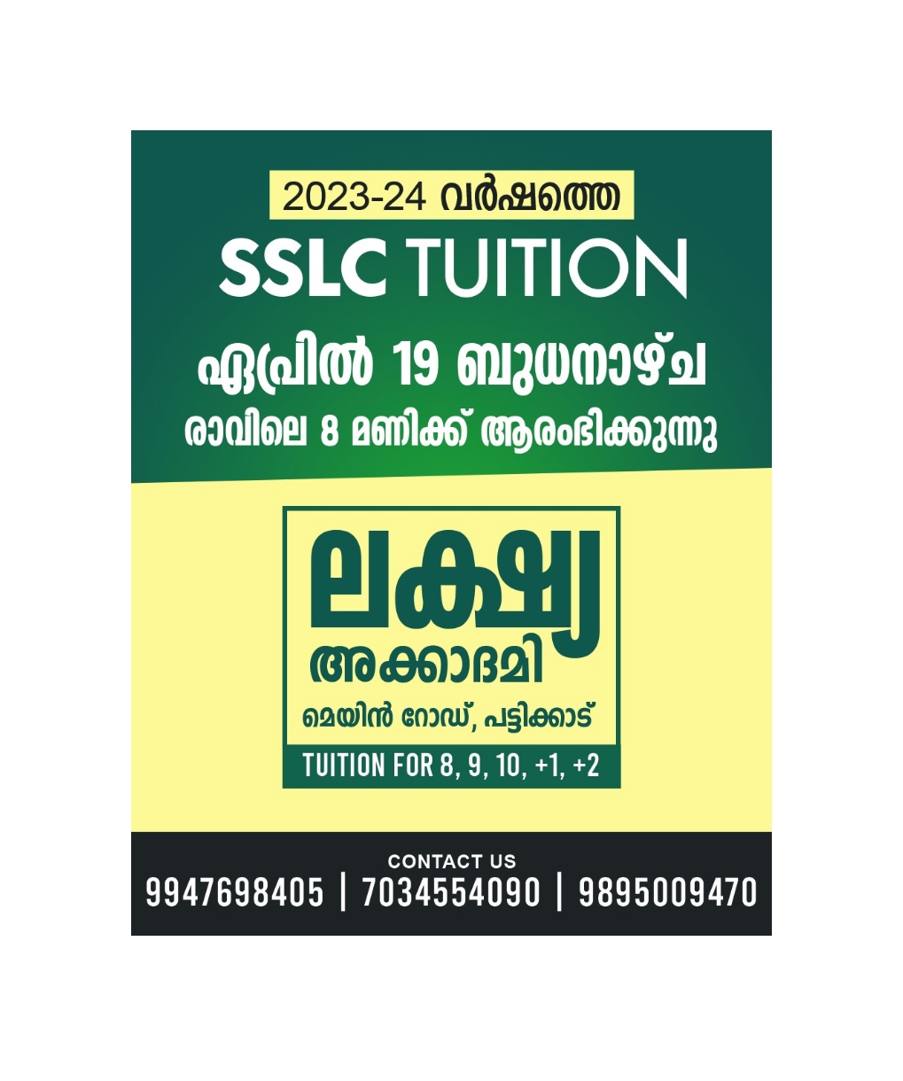 Local News 2023-24 വർഷത്തെ SSLC TUITION ആരംഭിക്കുന്നു By Author / March 19, 2023 Share this News 2023-24 വർഷത്തെ SSLC TUITION ആരംഭിക്കുന്നുഏപ്രിൽ 19 ബുധനാഴ്ച രാവിലെ 8 മണിക്ക് ആരംഭിക്കുന്നുലക്ഷ്യ അക്കാദമിമെയിൻ റോഡ്, പട്ടിക്കാട് TUITION FOR 8, 9, 10, +1, +2📱CONTACT US 9947698405 | 7034554090 | 989502847 Post Views: 268 Post navigation Previous ചെ.പ്പു.കോ.വെ സാംസ്ക്കാരികോത്സവം സമാപിച്ചുNext മാള മെറ്റ്സ് കോളേജിൽ “റോബോട്ടിക്സ്” ഏകദിന ശില്പശാല സംഘടിപ്പിച്ചു