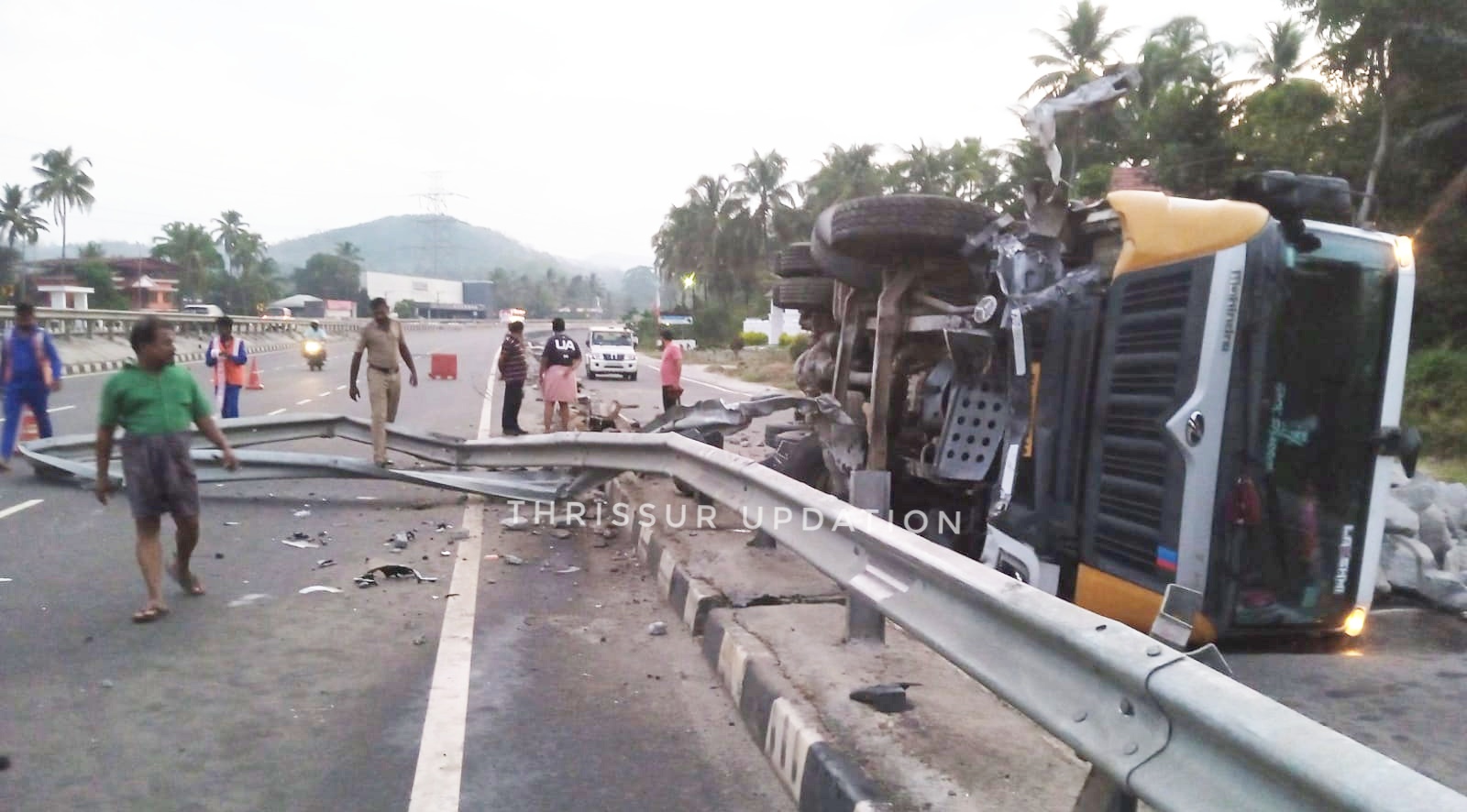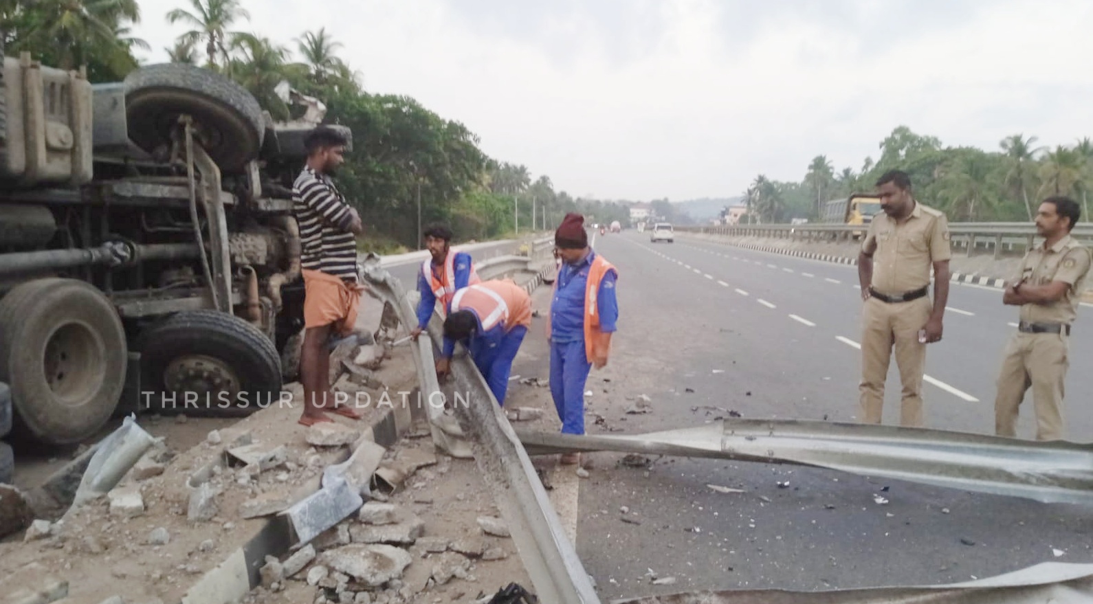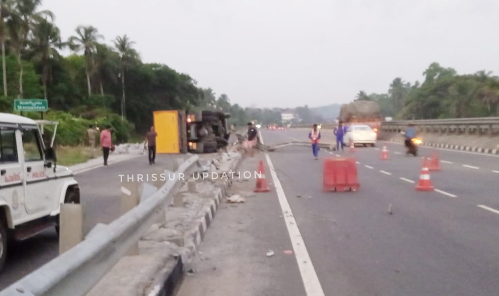 ദേശീയ പാത 544 താണിപ്പാടത്ത് തൃശൂർ ഭാഗത്തേക്ക് പോകുന്ന ട്രാക്കിൽ ടിപ്പർ . ഡി വൈഡറിൽ ഇടിച്ച് സർവ്വീസ് റോഡിലേക്ക് മറിഞ്ഞു. ഇന്ന് പുലർച്ചെയാണ് അപകടം ഉണ്ടായത് പോലീസും ഹൈവേ എമർജൻസി ടീമും എത്തി ദേശീയ പാതയിലേക്ക് തള്ളി നിന്ന അയേൺ ബാരിക്കേഡ് മാറ്റുന്നതിനുള്ള നടപടികൾ സ്വീകരിക്കുന്നു. ഡ്രൈവർക്ക് ചെറിയ പരിക്ക്