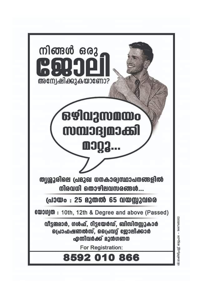 തൃശ്ശൂരിലെ പ്രമുഖ ധനകാര്യസ്ഥാപനങ്ങളിൽ നിരവധി തൊഴിലവസരങ്ങൾ…