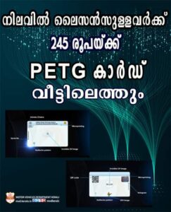 നിലവിൽ ലൈസൻസുള്ളവർക്ക് 245 രൂപയ്ക്ക് PETG കാർഡ് വീട്ടിലെത്തും