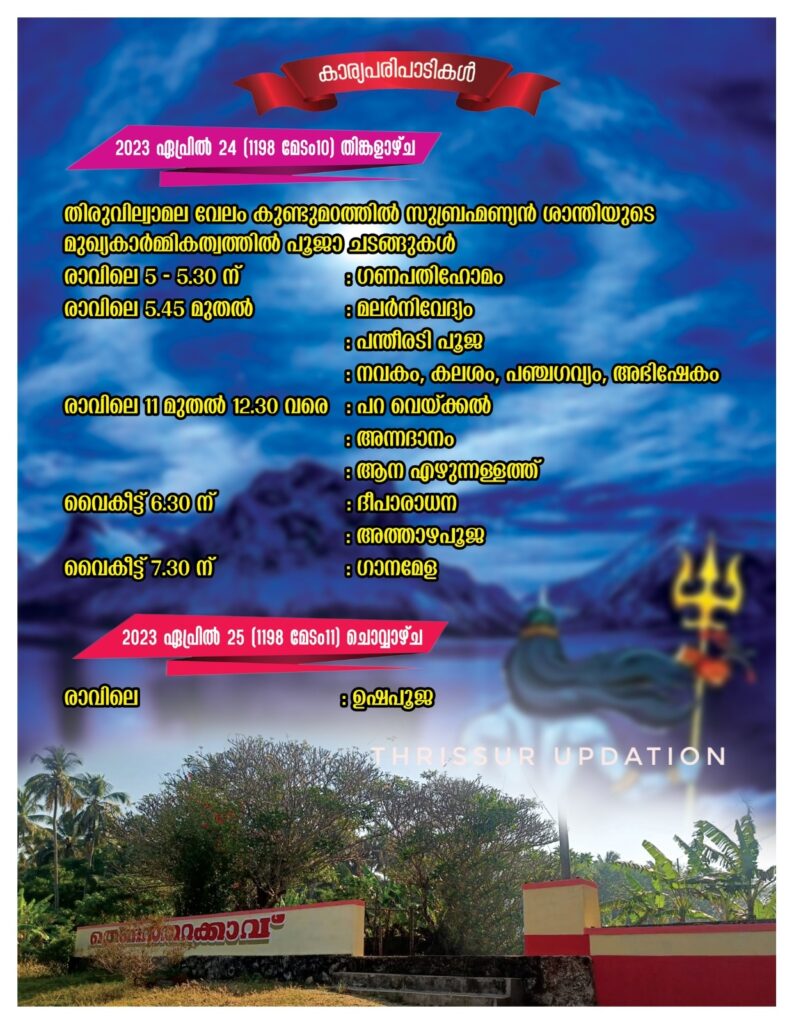 തിരുവില്വാമല വേലം കുണ്ടുമഠത്തിൽ സുബ്രഹ്മണ്യൻ ശാന്തിയുടെ മുഖ്യകാർമ്മികത്വത്തിൽ പൂജാ ചടങ്ങുകളും