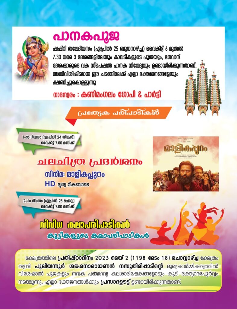 വിശേഷാൽ പൂജകളും അഭിഷേകങ്ങളും നിവേദ്യങ്ങളും ഉണ്ടായിരിക്കുന്നതാണ്. ഇന്ന് വൈകീട്ട് 6 മണിക്ക് 3 ദേശക്കാവടികളുടെ പൂജയും വിശേഷാൽ പാനക നിവേദ്യവും നടക്കും. 7.30 ന് വിവിധ കലാപരിപാടികളും ഉണ്ടായിരിക്കും