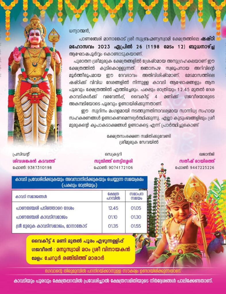 പാണഞ്ചേരി മാനാങ്കോട് ശ്രീ സുബ്രഹ്മണ്യസ്വാമി ക്ഷേത്രത്തിലെ ഷഷ്ഠി മഹോത്സവം 2023 ഏപ്രിൽ 26 (1198 മേടം 12) ബുധനാഴ്ച്ച നടത്തുന്നു