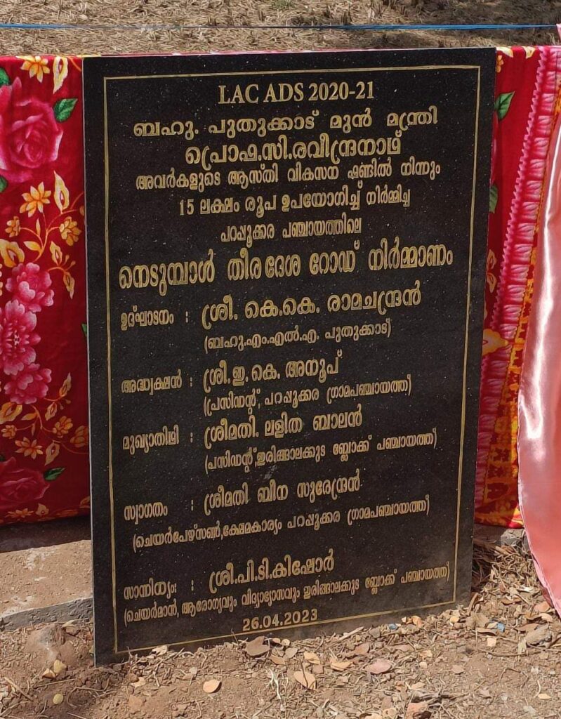 പറപ്പൂക്കര പഞ്ചായത്തിലെ നെടുമ്പാൾ തീരദേശ റോഡ് കെ കെ രാമചന്ദ്രൻ എംഎൽഎ ജനങ്ങൾക്കായി സമർപ്പിച്ചു. പുതുക്കാട് മുൻ മന്ത്രി സി രവീന്ദ്രനാഥിന്റെ ആസ്തി വികസന ഫണ്ടിൽ നിന്നും 15 ലക്ഷം രൂപ ചെലവഴിച്ചാണ് റോഡ് നിർമ്മാണം പൂർത്തീകരിച്ചത്. 80 മീറ്റർ ദൈർഘ്യമാണ് റോഡിലുള്ളത്.
