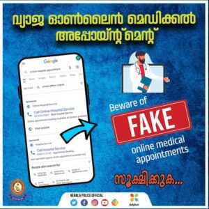 വ്യാജ ഓൺലൈൻ മെഡിക്കൽ അപ്പോയ്ന്റ്മെന്റ് തട്ടിപ്പ് ; മുന്നറിയിപ്പുമായി കേരള പോലീസ്