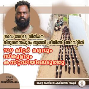 ഡ്രൈ ഡേ ദിനത്തിൽ തിരുവനന്തപുരം സ്പെഷ്യൽ സ്ക്വാഡ് നടത്തിയ റെയ്ഡിൽ വെട്ടുകാട് ബാലനഗർ കോളനിയിൽ നിന്നും ഒരാളെ 100 ലിറ്റർ മദ്യവുമായി പിടികൂടി. ആക്ടീവ സ്കൂട്ടറിൽ കറങ്ങി നടന്ന് നഗരത്തിൽ വൻതോതിൽ മദ്യ വിൽപ്പന നടത്തുന്ന ബാലനഗർ കോളനി നിവാസിയായ സൂര്യ എന്ന് വിളിക്കുന്ന ശ്രീജിത്തിനെ ആണ് അറസ്റ്റ് ചെയ്തത്.