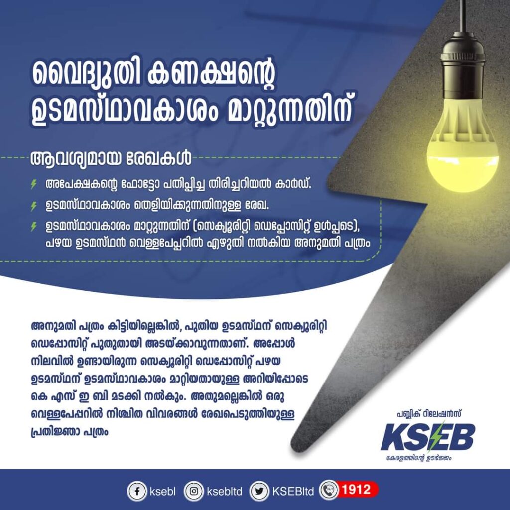 വൈദ്യുതി കണക്ഷന്റെ ഉടമസ്ഥാവകാശം മാറ്റുന്നതിന് വേണ്ട രേഖകൾ വിശദീകരിച്ചു കെ എസ് ഇ ബി.