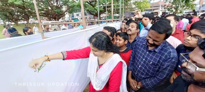 ജില്ലാ കലക്ടർ ഹരിത വി കുമാർ ചിത്രരചന ചിത്രം വരച്ച് ഉദ്ഘാടനം ചെയ്തു.ഭംഗിയുള്ള സ്വപ്നങ്ങളാണ് കുട്ടികളുടേതെന്നും ബോക്സുകളില്ലാതെ ചിന്തിക്കാൻ അവർക്ക് കഴിയട്ടെയെന്നും കലക്ടർ ആശംസിച്ചു.സംസ്ഥാന സർക്കാരിന്റെ ഒന്നാം വാർഷികത്തോട് അനുബന്ധിച്ച് വിദ്യാഭ്യാസ വകുപ്പിൻ്റെ 18 ബ്ലോക്ക് റിസോഴ്സ് സെന്ററുകളിലും എൽ പി, യു പി, ഹൈസ്ക്കൂൾ, എച്ച് എസ് വിഭാഗങ്ങളിലായി നടത്തിയ ചിത്ര രചന മത്സരത്തിൽ ഒന്നും രണ്ടും മൂന്നും സ്ഥാനങ്ങൾ ലഭിച്ചവരാണ് തെക്കേ ഗോപുരനടയ്ക്ക് സമീപം തയ്യാറാക്കിയ വലിയ ക്യാൻവാസിൽ ചിത്രങ്ങൾ വരച്ചത്.