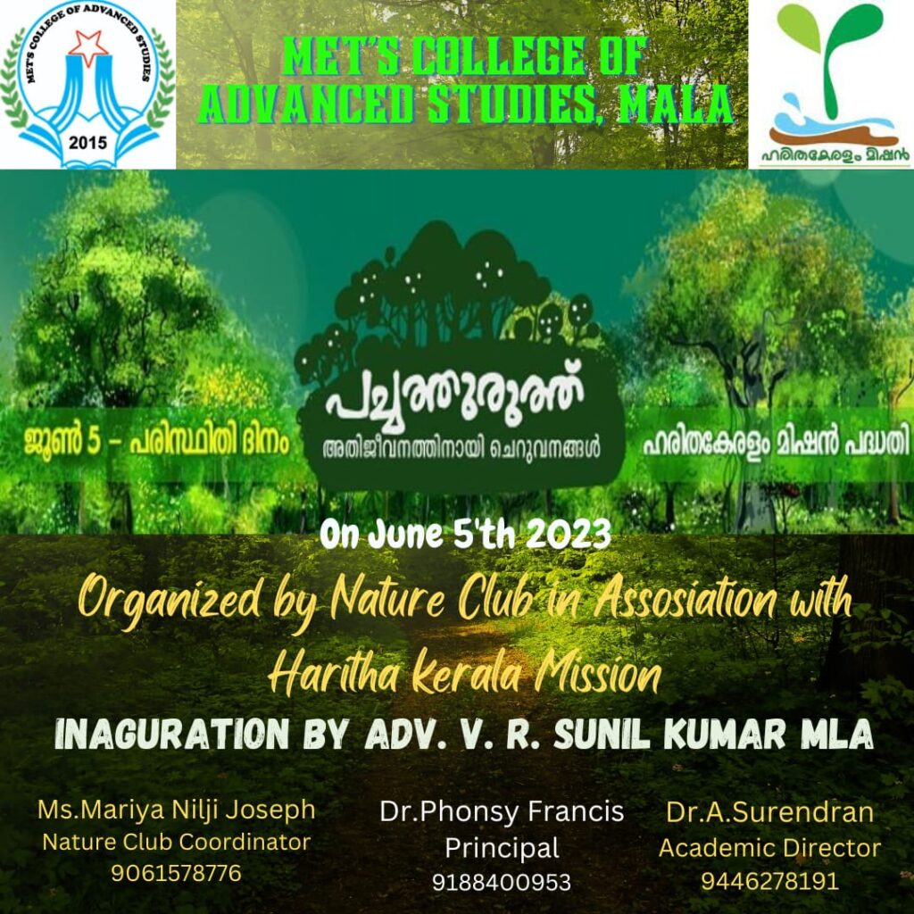 കൂടാതെ മെറ്റ്സ് കോളേജ് ഓഫ് അഡ്വാൻസ് സ്റ്റഡീസിലെ നേച്ചർ ക്ലബ്ബും ഹരിത കേരള മിഷൻ പ്രോജക്ട്, നവകേരള പ്രോഗ്രാമുമായി ചേർന്ന് കോളേജ് ക്യാമ്പസിൽ “പച്ചത്തുരുത്ത് ” വെച്ചുപിടിപ്പിക്കുന്നുണ്ട്. ഇതിൻറെ ഔപചാരികമായ ഉദ്ഘാടനം നാളെ രാവിലെ 11:45ന് കൊടുങ്ങല്ലൂർ എംഎൽഎ വി. ആർ. സുനിൽകുമാർ നിർവഹിക്കുന്നതാണ്.