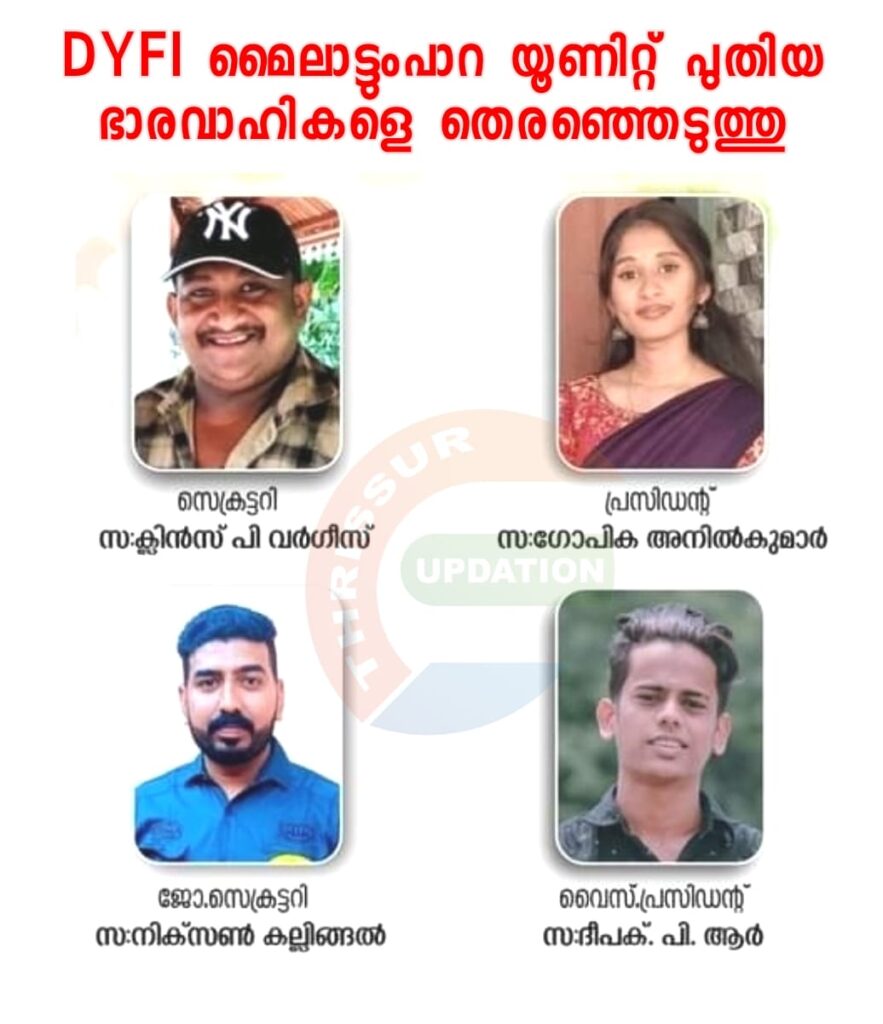 ഡിവൈഎഫ്ഐ മൈലാട്ടുംപാറ യൂണിറ്റ് സമ്മേളനം നടത്തി. DYFI മണ്ണുത്തി ബ്ലോക്ക് ജോയിന്റ് സെക്രട്ടറി അനീസ് അഹമ്മദ് സമ്മേളനം ഉദ്ഘാടനം ചെയ്തു. രാഹുൽ അരമനയിൽ സ്വാഗതം പറഞ്ഞ സമ്മേളനത്തിന് ക്ലിൻസ് പി വർഗ്ഗീസ് അധ്യക്ഷൻ ആയി