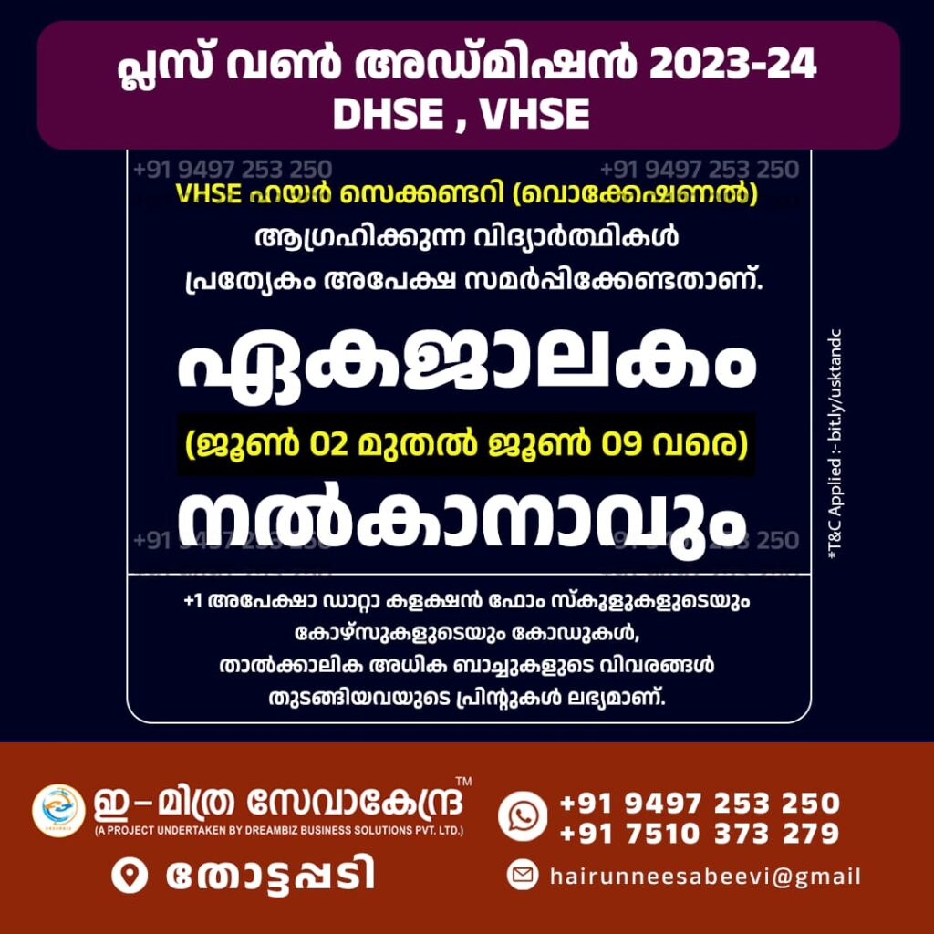 VHSE ഹയർ സെക്കണ്ടറി (വൊക്കേഷണൽ) ആഗ്രഹിക്കുന്ന വിദ്യാർത്ഥികൾ പ്രത്യേകം അപേക്ഷ സമർപ്പിക്കേണ്ടതാണ്. ഏകജാലകം (ജൂൺ 02 മുതൽ ജൂൺ 09 വരെ) നൽകാനാവും