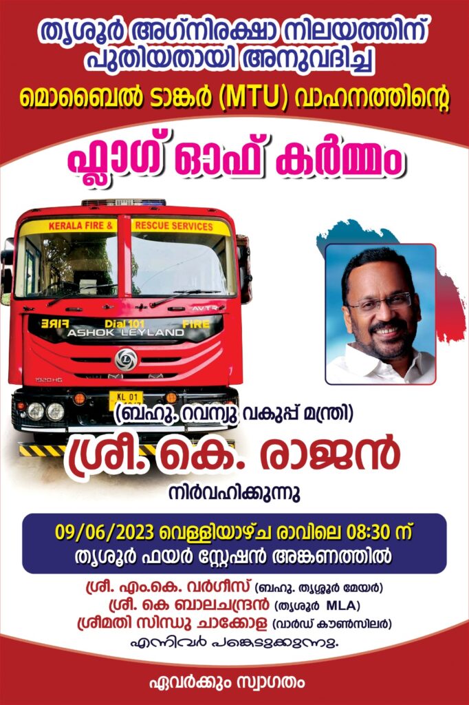 തൃശൂർ അഗ്നിരക്ഷാ നിലയത്തിന് പുതിയതായി അനുവദിച്ച മൊബൈൽ ടാങ്കർ (MTU) വാഹനത്തിന്റെ ഫ്ലാഗ് ഓഫ് കർമ്മം നാളെ രാവിലെ 8:30 ന് തൃശൂർ ഫയർ സ്റ്റേഷൻ അങ്കണത്തിൽ വെച്ച് റവന്യൂ വകുപ്പ് മന്ത്രി കെ. രാജൻ നാളെ നിർവഹിക്കും തൃശ്ശൂർ മേയർ എം.കെ. വർഗീസ്, തൃശൂർ എം.എൽ എ കെ ബാലചന്ദ്രൻ ,വാർഡ് കൗൺസിലർ സിന്ധു ചാക്കോള എന്നിവരും പങ്കെടുക്കും