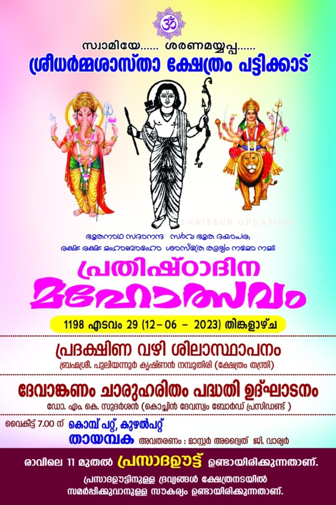 പട്ടിക്കാട് ശ്രീധർമശാസ്താ ക്ഷേത്ര പ്രതിഷ്ഠാദിന മഹോത്സവം; പ്രദക്ഷിണ വഴി ശിലാസ്ഥാപനം, ദേവാങ്കണം ചാരുഹരിതം പദ്ധതി ഉദ്ഘാടനവും ജൂൺ 12 തിങ്കളാഴ്ച നടത്തുന്നു