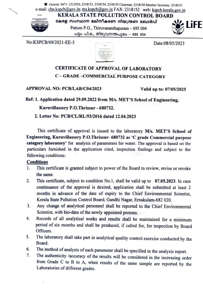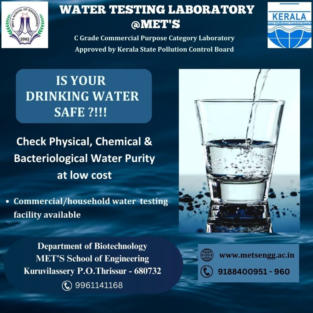 തൃശൂർ മാള മെറ്റ്സ് സ്കൂൾ ഓഫ് എൻജിനീയറിങ്ങിന് കേരള സർക്കാരിന്റെ കേരള സ്റ്റേറ്റ് പൊലൂഷൻ കൺട്രോൾ ബോർഡിന്റെ പരീക്ഷണശാലകൾക്കുള്ള “സി ഗ്രേഡ് കമ്മേഴ്സ്യൽ സർട്ടിഫിക്കറ്റ് ” ലഭിച്ചു. ഇനി വീടുകളിലെയും വ്യവസായ വാണിജ സ്ഥാപനങ്ങളുടെയും വെള്ളത്തിന്റെ പ്യൂരിറ്റി ചെക്ക് ചെയ്യുന്നതിന് കോളേജിന്റെ ബയോ ടെക്നോളജി പരീക്ഷണശാലയിൽ പോയാൽ മതി. വീട്ടിലെ കുടിവെള്ളം, പൊതുകിന്നറുകളിലെ വെള്ളം, കുഴൽ കിണർ വെള്ളം, ഹോട്ടൽ ബേക്കറി സ്ഥാപനങ്ങളിലെയും വ്യവസായശാലകളിലേയും ഉപയോഗിക്കുന്ന ജലത്തിലെ ഫിസിക്കൽ, കെമിക്കൽ, ബാക്ടീരിയോളജിക്കൽ, തുടങ്ങി16 തരം ടെസ്റ്റുകൾ വളരെ വേഗത്തിൽ ചെയ്യുവാനുള്ള അത്യാധുനിക സൗകര്യങ്ങൾ ബയോടെക്നോളജി ലാബിൽ ഒരുക്കിയിട്ടുണ്ട്. കേരള സ്റ്റേറ്റ് പൊലൂഷൻ കൺട്രോൾ ബോർഡ് കോളേജിലെ അടിസ്ഥാന സൗകര്യങ്ങളുടെ കർശന പരിശോധനകൾ നടത്തിയ ശേഷമാണ് സർട്ടിഫിക്കേഷൻ ലഭിച്ചത്. വെള്ളം ടെസ്റ്റ് ചെയ്യുന്നതിൻറെ കൂടുതൽ വിവരങ്ങൾക്ക് മെറ്റ്സ് കോളേജ് ബയോ ടെക്നോളജി വിഭാഗം മേധാവി പ്രൊഫ. ദീപക് വർഗീസിനെ 9961141168 എന്ന മൊബൈൽ നമ്പറിൽ ബന്ധപ്പെടുക.