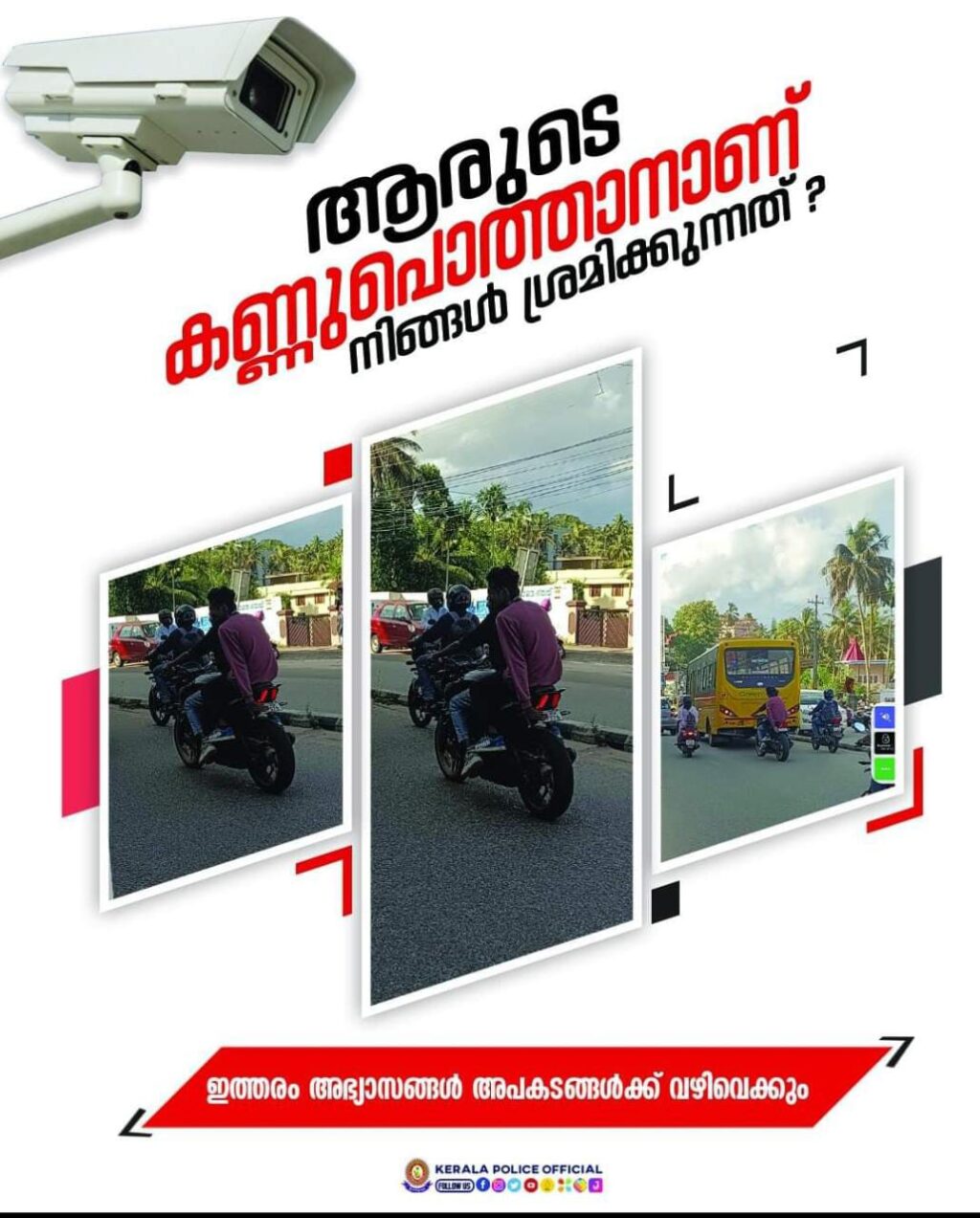 നിരത്തുകളിലെ ക്യാമറയിൽ പെടാതിരിക്കാൻ ഇരുചക്രവാഹങ്ങളുടെ പിന്നിലിരുന്നു നമ്പർ പ്ലേറ്റുകൾ മറച്ചു പിടിക്കുന്നവരുടെ ശ്രദ്ധയ്ക്ക് !! അപകടകരമായ അഭ്യാസമാണ് കാണിക്കുന്നതെന്നും പിറകിലേക്ക് മറിഞ്ഞു വീണു അപകടം ഉണ്ടാകാനിടയുള്ള ഈ ഉദ്യമം കൊണ്ട് നിയമലംഘനം മറയ്ക്കാമെന്നത് നിങ്ങളുടെ വ്യാമോഹം മാത്രമാണെന്നും കേരള പോലീസ്