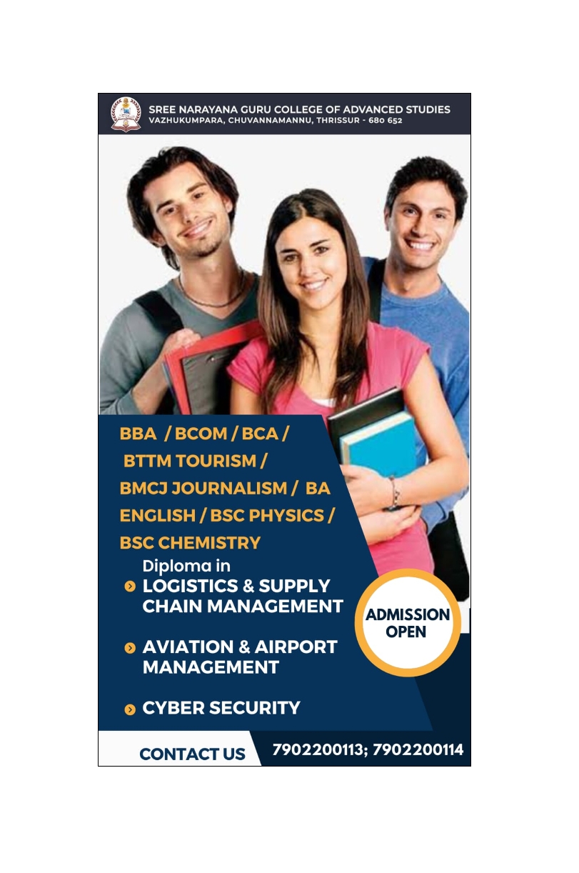 ശ്രീനാരായണഗുരു കോളേജ് ഓഫ് അഡ്വാൻസ്ഡ് സ്റ്റഡീസ്, വഴുക്കുംപാറ കോളേജിൽ മൂന്നുവർഷത്തെ ബിരുദ കോഴ്സുകളിലേക്കുള്ള ഈ വർഷത്തെ അഡ്മിഷൻ ആരംഭിച്ചിരിക്കുന്നു. കാലിക്കറ്റ് യൂണിവേഴ്സിറ്റി അഫിലിയേറ്റ് ചെയ്തിട്ടുള്ള ഈ കോളേജിന് യൂണിവേഴ്സിറ്റി തലത്തിൽ 12 റാങ്കുകൾ ലഭിച്ചിട്ടുണ്ട്.