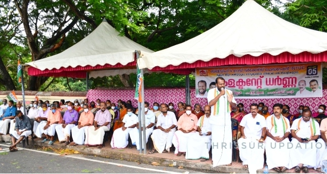 ബിൽഡിംഗ് & റോഡ് വർക്കേഴ്സ് ഫെഡറേഷൻ -INTUC തൃശൂർ ജില്ല കമ്മറ്റിയുടെ നേതൃത്വത്തിൽ കളക്ടറേറ്റിനു മുന്നിൽ നടത്തിയ പ്രതിഷേധ ധർണ്ണ DCC പ്രസിഡന്റ് ജോസ്സ് വള്ളൂർ ഉദ്ഘാടനം ചെയ്തു. ഇടതുപക്ഷ പിണപിണറായി സർക്കാരിന്റെ തൊഴിലാളി വിരുദ്ധ നയത്തിൽ പ്രതിക്ഷേധിച്ചും തൊഴിലാളികളുടെ 2020 മുതൽ കെട്ടികിടക്കുന്ന പെൻഷൻ അടക്കമുള്ള വിവിധ ആനുകൂല്യങ്ങൾ ഉടൻ വിതരണം ചെയ്യുക ,സെസ്സ് പിരിക്കുവാനുള്ള ഫ്ലാറ്റുകളും നിർമ്മാണ പ്രവർത്തികളും കണ്ടെത്തി സെസ്സ് പിരിച്ചെടുക്കുക