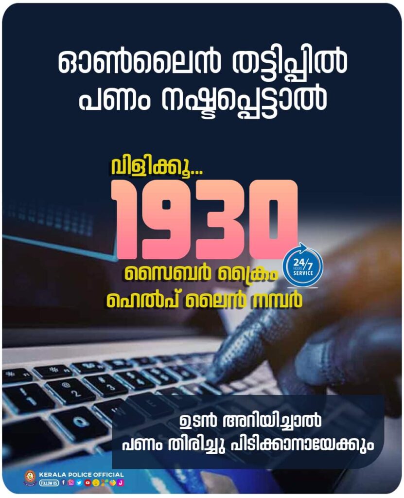 ഓൺലൈൻ തട്ടിപ്പിൽ പണം നഷ്ടപ്പെട്ടാൽ, വിളിക്കൂ..1930 സൈബർ ക്രൈം ഹെൽപ് ലൈൻ നമ്പർ; മുന്നറിയിപ്പുമായി കേരള പോലീസ്