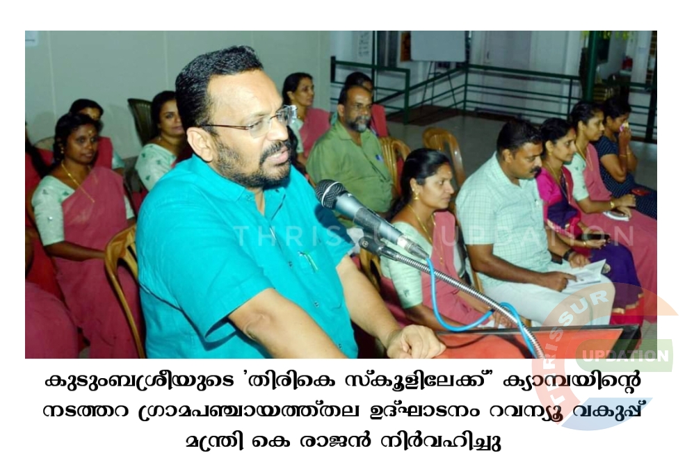 കുടുംബശ്രീയുടെ ‘തിരികെ സ്കൂളിലേക്ക്’ ക്യാമ്പയിന്റെ നടത്തറ ഗ്രാമപഞ്ചായത്ത്തല ഉദ്ഘാടനം റവന്യൂ വകുപ്പ് മന്ത്രി കെ രാജൻ നിർവഹിച്ചു