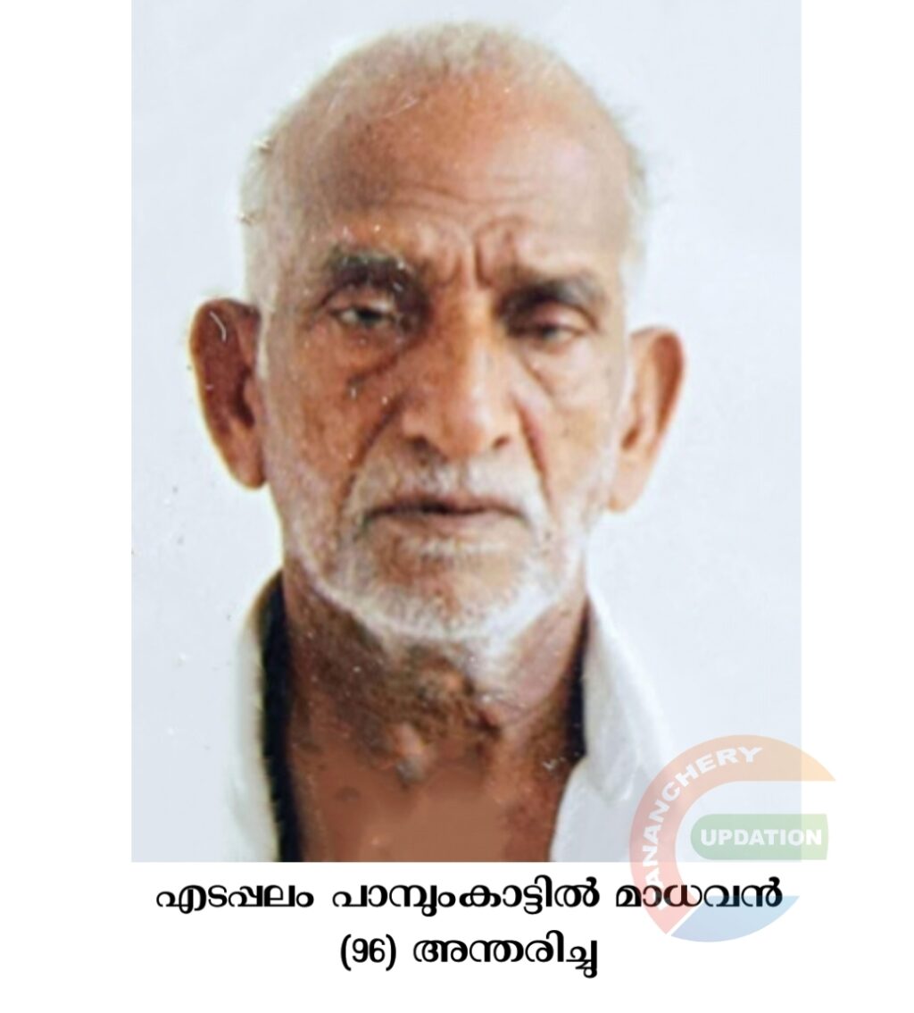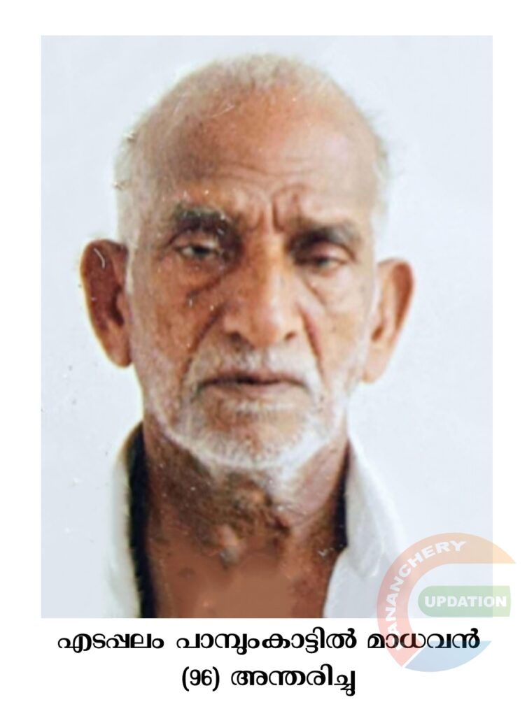 മാധവൻ (96) അന്തരിച്ചു.സംസ്ക്കാരം ഇന്ന് (02.10.2023 തിങ്കളാഴ്ച ) വൈകീട്ട് 4 മണിക്ക് വടക്കുംപാടം ആത്മാലയത്തിൽ.ഭാര്യ: സരോജിനി (തങ്കം). മക്കൾ: സുന്ദരി, വത്സല, മോഹനൻ, രാജൻ, വാസന്തി, മരുമക്കൾ: ശ്രീനിവസൻ, പരേതനായ ബാലകൃഷ്ണൻ, അജിത, ഡോ. ജയന്തി, നടരാജൻ.