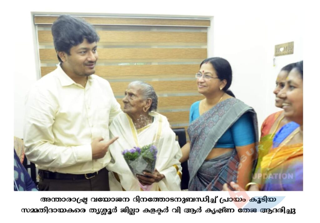 അന്താരാഷ്ട്ര വയോജന ദിനത്തോടനുബന്ധിച്ച് പ്രായം കൂടിയ സമ്മതിദായകരെ തൃശ്ശൂർ ജില്ലാ കളക്ടര് വി ആര് കൃഷ്ണ തേജ ആദരിച്ചു