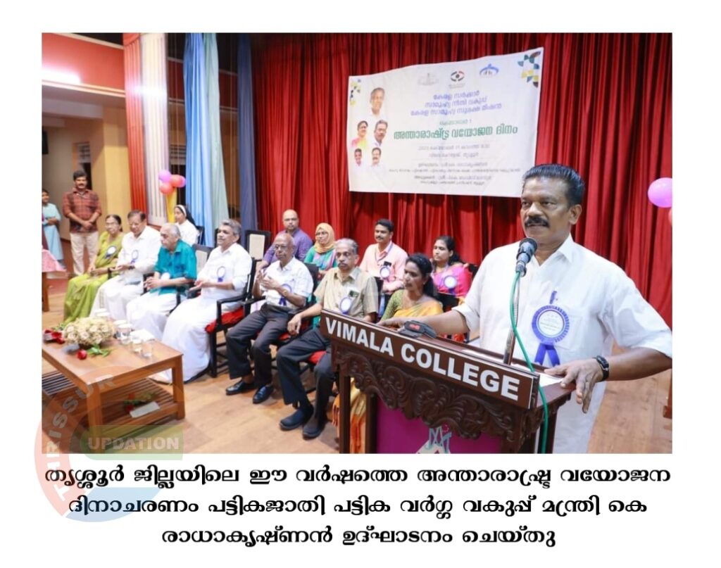 തൃശ്ശൂര് ജില്ലയിലെ ഈ വര്ഷത്തെ അന്താരാഷ്ട്ര വയോജന ദിനാചരണം പട്ടികജാതി പട്ടിക വര്ഗ്ഗ വകുപ്പ് മന്ത്രി കെ രാധാകൃഷ്ണന് ഉദ്ഘാടനം ചെയ്തു