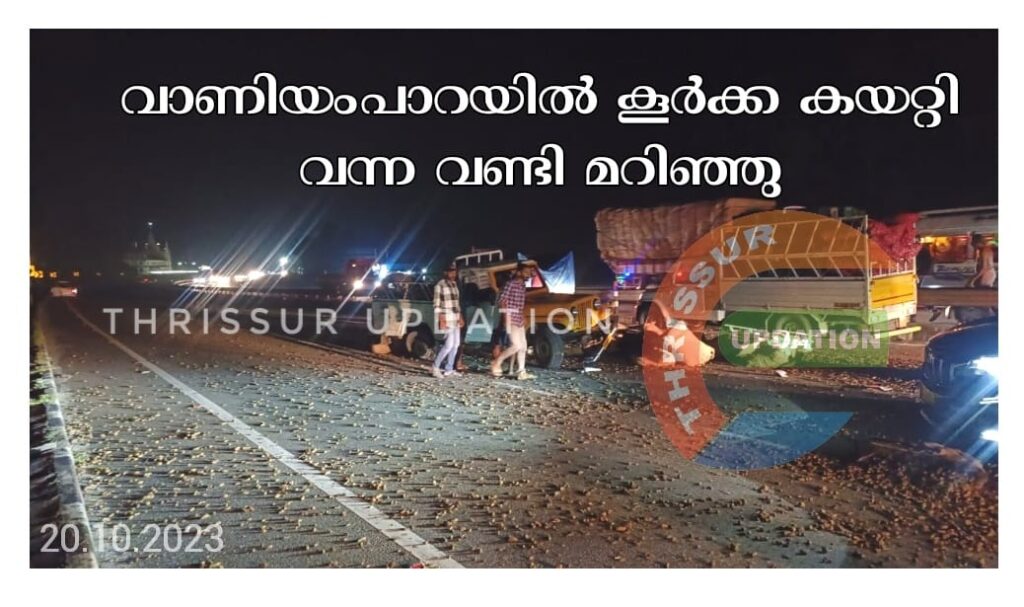 വാണിയംപാറയ്ക്കും കൊമ്പഴയ്ക്കും ഇടയിൽ SN നഗറിൽ കൂർക്ക കയറ്റി വന്ന വണ്ടി മറിഞ്ഞു.തൃശ്ശൂർ ഭാഗത്തേക്ക് പോകുന്ന കൂർക്ക കയറ്റി വന്ന വാഹനം ടയർ പൊട്ടിയതിനെ നിയന്ത്രണം വിട്ട് ഡിവൈഡറിൽ ഇടിച്ചു കയറി രണ്ടു മറിച്ചൽ മറിഞ്ഞത്.രണ്ട് പേർക്ക് പരുക്ക് പറ്റി.ഉടൻ തന്നെ 108 ആംബുലൻസിൽ കയറ്റി ആശുപത്രിയിലേക്ക് കൊണ്ടുപോയി.ഒരാളുടെ ചെവിക്ക് ഗുരുതരമായി പരുക്ക് പറ്റിയിട്ടുണ്ട്. വണ്ടി മറിഞ്ഞതിനെ തുടർന്ന് റോഡിൽ ഗതാഗതം തടസപ്പെട്ടു. ഹൈവേ എമർജർസി ടീമും നാട്ടുക്കാരും ചേർന്ന് റോഡിലെ കൂർക്ക മാറ്റി ഗതാഗതം പുന:സ്ഥാപിച്ചു.