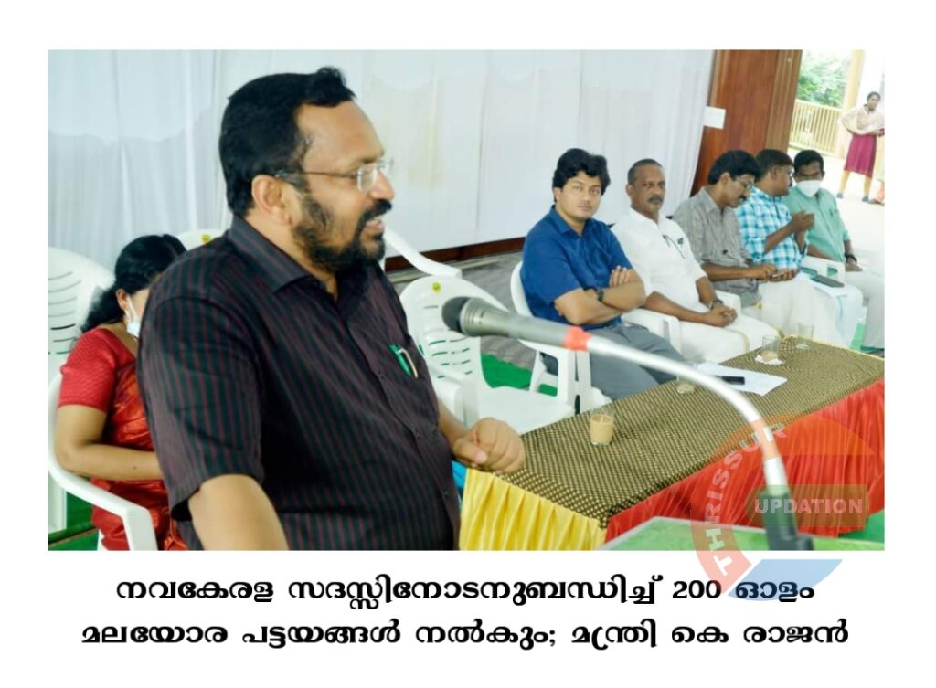 ഇരുന്നൂറോളം മലയോര പട്ടയങ്ങൾ നവകേരള സദസ്സിനോടനുബന്ധിച്ച് നൽകാൻ ലക്ഷ്യമിടുന്നതായി റവന്യൂ വകുപ്പ് മന്ത്രി കെ രാജൻ. ഒല്ലൂർ മണ്ഡലതല നവ കേരള സദസ്സ് സംഘാടക സമിതി രൂപീകരണ യോഗത്തിന്റെ ഉദ്ഘാടനം നിർവഹിച്ചു സംസാരിക്കുകയായിരുന്നു മന്ത്രി. ഡിസംബർ അഞ്ചിന് ഉച്ചതിരിഞ്ഞ് 3 മണിക്ക് പുത്തൂർ സുവോളജിക്കൽ പാർക്കിൽ നവ കേരള സദസ്സ് നടക്കും.