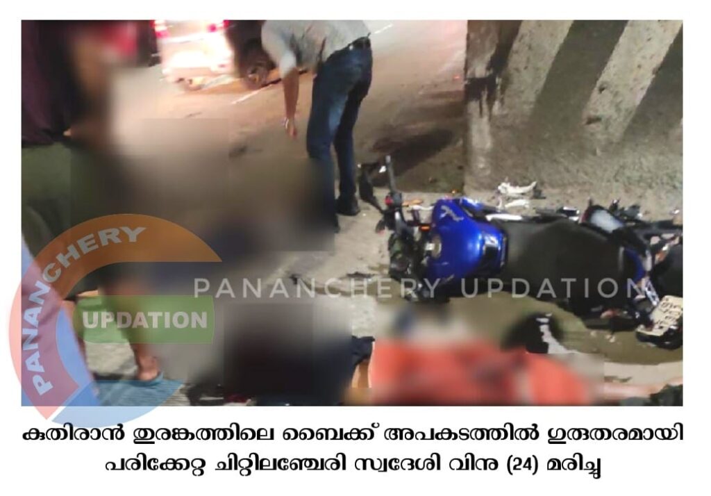 കുതിരാൻ തുരങ്കത്തിനുള്ളിൽ ഉണ്ടായ ബൈക്ക് അപകടത്തിൽ ഗുരുതരമായി പരിക്ക് പറ്റി ചികിത്സയിലിരുന്ന ചിറ്റിലഞ്ചേരി സ്വദേശി വിനു (24) മരിച്ചു. എളനാട് സ്വദേശി മിഥുൻ (17) സാരമായ പരുക്കകളോടെ ചികിത്സയിൽ കഴിയുന്നു. രാത്രി എട്ടുമണിയോടെ പാലക്കാട് ഭാഗത്തേക്കുള്ള പാതയിലാണ് അപകടമുണ്ടായത്. നിയന്ത്രണം വിട്ട ബൈക്ക് തുരങ്കത്തിനുള്ളിലെ രണ്ടാമത്തെ എമർജൻസി എക്സിറ്റിലെ തൂണിൽ ഇടിച്ചാണ് അപകടം. അപകടത്തിൽ ബൈക്ക് പൂർണമായും തകർന്നു.