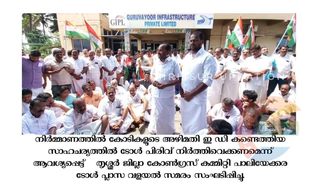 നിർമ്മാണത്തിൽ കോടികളുടെ അഴിമതി ഇ ഡി കണ്ടെത്തിയ സാഹചര്യത്തിൽ ടോൾ പിരിവ് നിർത്തിവെക്കണമെന്ന് ആവശ്യപ്പെട്ട് തൃശ്ശൂർ ജില്ലാ കോൺഗ്രസ് കമ്മിറ്റി പാലിയേക്കര ടോൾ പ്ലാസ വളയൽ സമരം സംഘടിപ്പിച്ചു. തൃശ്ശൂർ എംപി ടി എൻ പ്രതാപൻ സമരം ഉദ്ഘാടനം ചെയ്തു. ഡിസിസി പ്രസിഡന്റ് ജോസ് വള്ളൂർ അധ്യക്ഷത വഹിച്ചു. തുടർന്ന് നടന്ന പ്രതിഷേധത്തിൽ സംഘർഷം ഉണ്ടാവുകയും ടി എൻ പ്രതാപനനും ജോസ് വെള്ളൂരിനും അനിൽ അക്കരയ്ക്കും പരിക്കേറ്റു. കോൺഗ്രസ് പ്രവർത്തകർ ബാരിക്കേഡുകൾ മാറ്റി വാഹനങ്ങൾ കടത്തിവിടുകയും തടസ്സം ഉണ്ടാക്കാൻ വന്ന പോലീസുമായി സംഘർഷം ഉണ്ടാവുകയും ചെയ്തു. ഈ സമയം ടോൾ പ്ലാസ ഓഫീസിലേക്ക് പ്രവേശിച്ച് ജി ഐ പി എൽ ഉദ്യോഗസ്ഥരുമായി എംപിക്കും ഡിസിസി പ്രസിഡണ്ടിനും സംസാരിക്കണമെന്ന ആവശ്യം പോലീസ് നിരാഹരിച്ചതോടെ രൂക്ഷമായ സംഘർഷത്തിലേക്ക് സമരം വഴിമാറി. പോലീസും നേതാക്കളും തമ്മിൽ ഉന്തും തള്ളുമായി പരിക്കേറ്റ നേതാക്കളും പ്രവർത്തകരും ഓഫീസിനു മുമ്പിൽ കുത്തിയിരുന്ന് പ്രതിഷേധിച്ചു. പോലീസ് അക്രമം കാണിക്കുകയാണെന്നും തനിക്കും പരിക്കേറ്റത്തോടെ പോലീസുകാർക്ക് പരിക്കേറ്റന്ന് കാണിച്ച് കൗണ്ടർ കേസെടുക്കാനാണ് ശ്രമം എന്ന് ആരോപിച്ച എംപി വിഷയത്തിൽ ജില്ലാ കളക്ടറും പോലീസ് മേധാവിയും ഇടപെടുന്നതുവരെ സമരം അവസാനിപ്പിക്കില്ലെന്ന് നിലപാടെടുത്തു. തുടർന്ന് ജില്ലാ കളക്ടർ വി ആർ കൃഷ്ണതേജയും, ജില്ലാ പോലീസ് മേധാവി ഐശ്വര്യ ദോഗ്രയും സ്ഥലത്തെത്തി എംപിയെയും നേതാക്കളെയും കണ്ടു ഉറപ്പു നൽകിയതിനെ തുടർന്നാണ് സമരം അവസാനിപ്പിച്ചത്. ഇതോടെ എംപിയെയും പരുക്കായവരെയും ജില്ലാ ആശുപത്രിയിലേക്ക് കൊണ്ടുപോയി. സമരത്തിൽ രമ്യ ഹരിദാസ് എംപി, അഡ്വക്കേറ്റ് ജോസഫ് ടാജറ്റ്, സുനിൽ അന്തിക്കാട്,സിസി