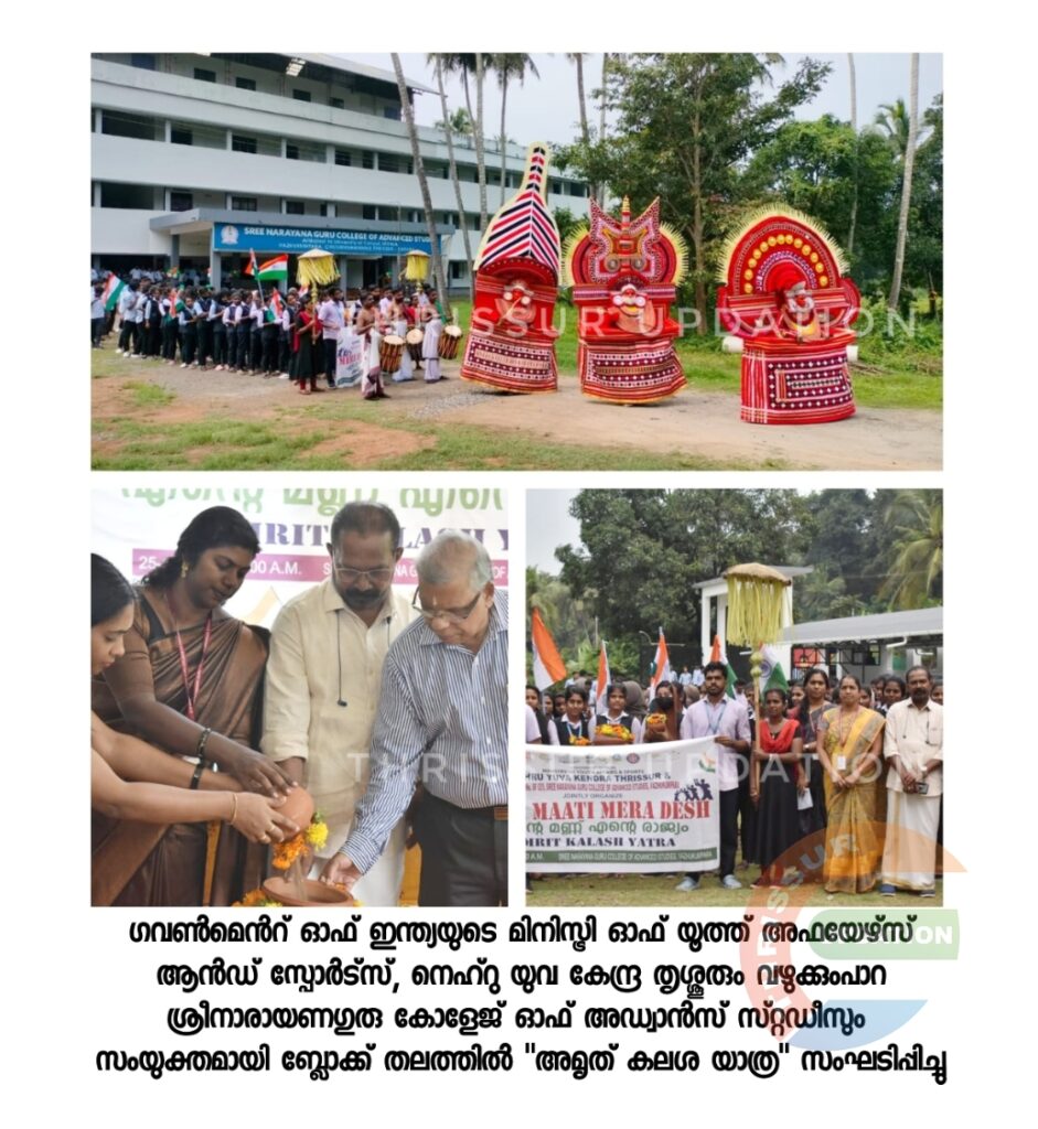 മേരി മാട്ടി മേരാ ദേശിന്റെ ഭാഗമായി കോളേജിൽ നിന്ന് മണ്ണ് ശേഖരണം നടത്തി, ഈ മണ്ണ് ഡൽഹിയിലെ പൂന്തോട്ട നിർമ്മാണത്തിനായി കൊണ്ടുപോകുന്നതിലൂടെ നമ്മുടെ ദേശത്തിലെ കൂട്ടായ്മയെ കുറിച്ച് ഉൽബോധിപ്പിക്കുന്നു. പഞ്ചായത്ത് പ്രസിഡന്റ് കെ.ആർ രവി മുഖ്യാതിഥിയായി ചടങ്ങ് ഉദ്ഘാടനം ചെയ്തു. കോളേജ് മാനേജർ സി. രാധാകൃഷ്ണൻ അമൃത കലശ യാത്രയ്ക്ക് ആശംസകൾ അർപ്പിച്ചു. പ്രിൻസിപ്പൽ ഡോ. കെ.എ.സതി അധ്യക്ഷതവഹിച്ചു.എൻ.വൈ.കെ യുടെ യൂത്ത് വളണ്ടിയർ അശ്വതി ചടങ്ങിൽ സ്വാഗതം പറഞ്ഞു. കോളേജിന്റെ എൻഎസ്എസ് പ്രോഗ്രാം കോഡിനേറ്റർ രാഖില വി.ജി “പഞ്ച് പ്രാൺ” പ്രതിജ്ഞ ചൊല്ലിക്കൊടുത്തു. വൈസ് പ്രിൻസിപ്പൽ കെ. ആർ നീതു നന്ദി പറഞ്ഞു.
