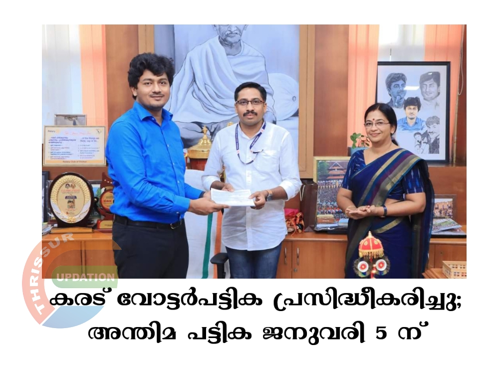 2024 ലെ പ്രത്യേക സംക്ഷിപ്ത വോട്ടര്പട്ടിക പുതുക്കലിന്റെ ഭാഗമായുള്ള കരട് വോട്ടര് പട്ടിക പ്രസിദ്ധീകരിച്ചു. കളക്ടറേറ്റില് നടന്ന ജില്ലാതല ഉദ്ഘാടനം ജില്ലാ കളക്ടര് വി ആര് കൃഷ്ണ തേജ തൃശ്ശൂര് നിയമസഭാമണ്ഡലം 60-ാം നമ്പര് പോളിംഗ് സ്റ്റേഷനിലെ ബൂത്ത് ലെവല് ഓഫീസര് ടി ജെ ബിജോയ്ക്ക് കരട് വോട്ടര് പട്ടിക കൈമാറി ഉദ്ഘാടനം നിര്വഹിച്ചു. ഡിസംബര് 9 വരെ കരട് വോട്ടര് പട്ടികയില് voters.eci.gov.in എന്ന വെബ്സൈറ്റിലൂടെയും വോട്ടര് ഹെല്പ് ലൈന് ആപ്പ് വഴിയും തിരുത്തലുകളും കൂട്ടിച്ചേര്ക്കലും നടത്താം. അന്തിമ വോട്ടര് പട്ടിക 2024 ജനുവരി അഞ്ചിന് പ്രസിദ്ധീകരിക്കും.