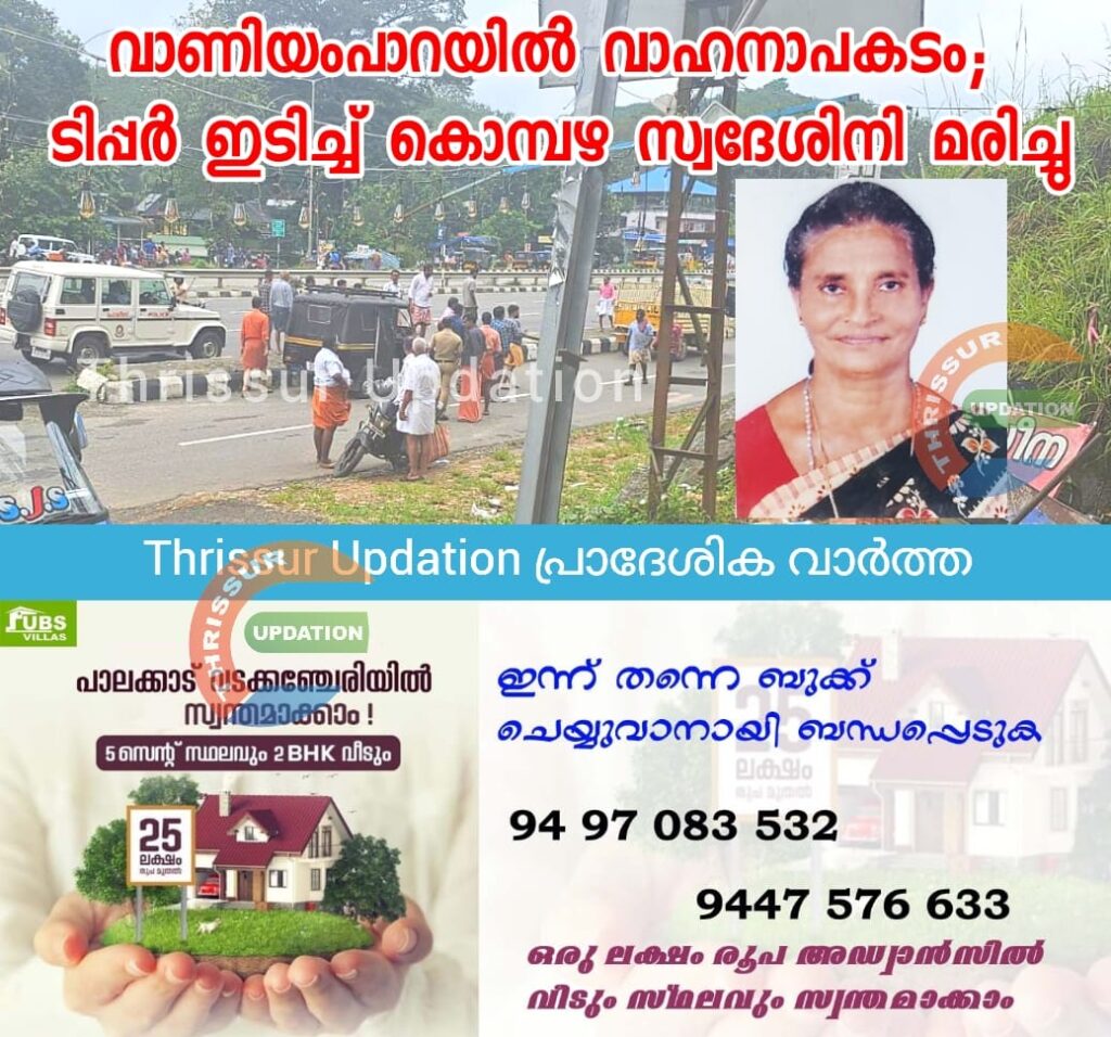 വാണിയമ്പാറയിൽ വാഹന അപകടത്തിൽ കൊമ്പഴ പെരുംതുമ്പ സ്വദേശി മാമ്പഴതുണ്ടിയിൽ അനിയൻ കുഞ്ഞിന്റെ ഭാര്യ മേരി വർഗ്ഗീസ് മരിച്ചു.ദേശീയപാതയിൽ ബസ്സിൽ നിന്നും ഇറങ്ങി റോഡ് അരികിലൂടെ നടന്നു വരികയായിരുന്ന സ്ത്രീയെ ടിപ്പർ വന്ന് ഇടിക്കുകയായിരുന്നു.ടിപ്പർ ഡ്രൈവർ മൊബൈൽ ഫോൺ ഉപയോഗിച്ചതോ ഉറങ്ങിയതോ ആവാം അപകടത്തിന് ഇടയാക്കിയതെന്ന് കണ്ടു നിന്ന നാട്ടുകാർ പറഞ്ഞു.