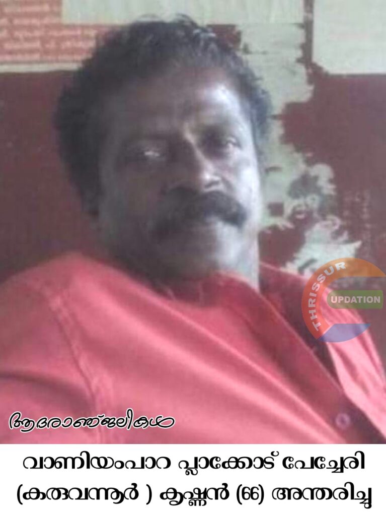 വാണിയംപാറ പ്ലാക്കോട് പേച്ചേരി (കരുവന്നൂർ ) കൃഷ്ണൻ (66) അന്തരിച്ചു. സംസ്ക്കാരം നാളെ (29.11.2023 ) രാവിലെ 9 ന് വടക്കുംപാടം ആത്മാലയത്തിൽ .ഭാര്യ: രമണി , മക്കൾ : രഞ്ജിൽ , രമ്യ .മരുമക്കൾ : രമ്യ , ഉണ്ണികൃഷണൻ.വാണിയമ്പാറ ക്ഷീരസംഘം ഭരണസമിതി അംഗം AITUCയുടെ നേതൃത്വം സിപിഐ വാണിയമ്പാറ ബ്രാഞ്ച് സെക്രട്ടറി എന്നീ നിലകളിൽ പ്രവർത്തിച്ചു വരുന്നു ക്ഷീരസംഘം ഭരണസമിതി അംഗമായി കഴിഞ്ഞ 25വർഷമായി തിരഞ്ഞെടുക്കപ്പെട്ടുവരുന്നു.