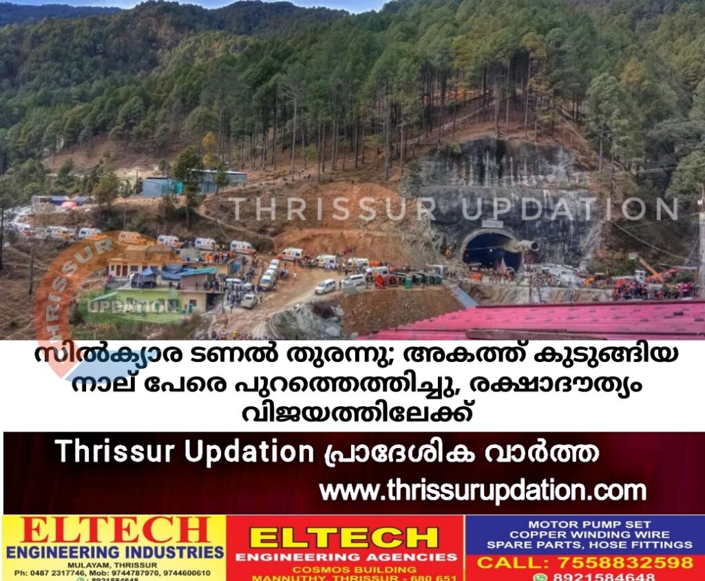 പതിനേഴ് ദിവസത്തെ പരിശ്രമത്തിന് ശേഷം സിൽക്യാര ടണൽ തുരന്നു അകത്ത് കുടുങ്ങിയ നാല് പേരെ പുറത്തെത്തിച്ചു എസ് ഡി ആര് എഫ് സംഘം ആംബുലൻസുമായി അകത്തേക്ക് പോയി കുടുങ്ങിക്കിടന്ന തൊഴിലാളികളുമായി പുറത്തേക്ക് വന്നു. 41 പേരാണ് ടണലിന് അകത്ത് കുടുങ്ങിയത്. ഇവരെ പുറത്തെത്തിക്കാൻ 49 ആംബുലൻസുകൾ പുറത്ത് കാത്ത് നിന്നിരുന്നു. ഇന്നലെ യന്ത്രങ്ങളുടെ സഹായമില്ലാതെ നേരിട്ടുള്ള ഡ്രില്ലിംഗ് തുടങ്ങുകയും ദൗത്യം വിജയത്തിലെത്തുകയുമായിരുന്നു.