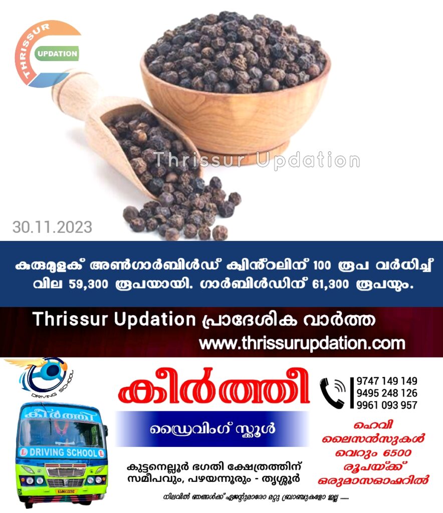 Local News കുരുമുളകിന് 100 രൂപ കൂടി By Author / November 30, 2023 Share this News കുരുമുളക് അൺഗാർബിൾഡ് ക്വിൻ്റലിന് 100 രൂപ വർധിച്ച് വില 59,300 രൂപയായി. ഗാർബിൾഡിന് 61,300 രൂപയും. Post Views: 210 Post navigation Previous റോബിന് ബസിന്റെ പെര്മിറ്റ് റദ്ദാക്കിNext തോപ്പിൽഭാസി പുരസ്കാരം നടൻ മധുവിന്