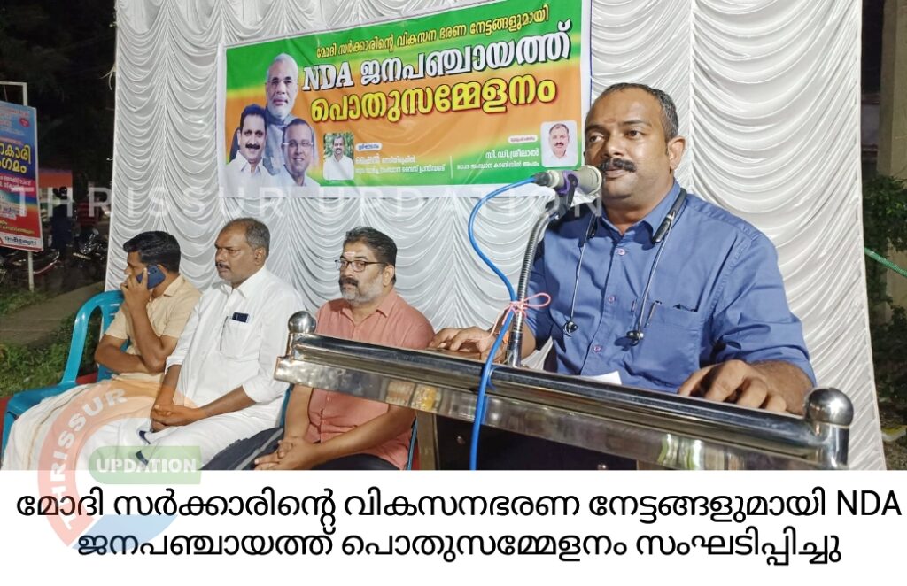 നരേന്ദ്ര മോദി സർക്കാരിന്റെ ക്ഷേമ പദ്ധതികളെ ജനങ്ങളിലേക്ക് എത്തിക്കുക എന്ന ലക്ഷ്യം മുന്നോട്ടു വച്ച് കൊണ്ട് NDA കേരളം ഘടകം നടത്തുന്ന ജനപഞ്ചായത്തു NDA പാണഞ്ചേരി പഞ്ചായത്തിൽ സംഘടിപ്പിച്ചു . യുവമോർച്ച സംസ്ഥാന വൈസ് പ്രസിഡന്റ് ഷൈൻ നെടിയിരുപ്പിൽ ഉദ്ഘാടനം നിർവഹിച്ച യോഗത്തിൽ NDA പീച്ചി മണ്ഡലം ചെയർമാൻ പ്രണീഷ് NH അധ്യക്ഷനായി BDJS സംസ്ഥാന സമിതി അംഗം C D. ശ്രീലാൽ മുഖ്യ പ്രഭാഷണം നടത്തി .