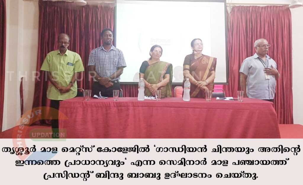 മഹാത്മാഗാന്ധിയെ പോലുള്ളവർ ഇന്ന് ജീവിച്ചിരുന്നെങ്കിൽ പല യുദ്ധങ്ങളും ഉണ്ടാകുമായിരുന്നില്ല. മനുഷ്യ ജീവനാണ് ലോകത്തിൽ ഏറ്റവും അമൂല്യമായത് എന്നതാണ് ഗാന്ധിയൻ ചിന്തയുടെ അന്തസത്ത – ബിന്ദു ബാബു. തൃശ്ശൂർ മാള സ്കൂൾ ഓഫ് എൻജിനീയറിങ്ങ് എൻഎസ്എസ് യൂണിറ്റ് സംഘടിപ്പിച്ച “ഗാന്ധിയൻ ചിന്തയും അതിൻറെ ഇന്നത്തെ പ്രാധാന്യവും” എന്ന സെമിനാർ ഉദ്ഘാടനം ചെയ്ത് സംസാരിക്കുകയായിരുന്നു മാള പഞ്ചായത്ത് പ്രസിഡന്റ് ബിന്ദു ബാബു. സെമിനാറിൽ വിഷയാവതരണവും മുഖ്യപ്രഭാഷണവും നടത്തിയത് ഇരിങ്ങാലക്കുട ക്രൈസ്റ്റ് കോളേജ് (ഓട്ടോണമസ് ) ലെ അദ്ധ്യാപകനായ പ്രൊഫ. (ഡോ.) അരുൺ ബാലകൃഷ്ണൻ. മെറ്റ്സ് സ്കൂൾ ഓഫ് എൻജിനീയറിങ്ങ് പ്രിൻസിപ്പാൾ പ്രൊഫ. (ഡോ.) അംബികാദേവി അമ്മ ടി. അദ്ധ്യക്ഷത വഹിച്ച ചടങ്ങിൽ മെറ്റ്സ് പോളിടെക്നിക് എൻഎസ്എസ് യൂണിറ്റ് പ്രോഗ്രാം ഓഫീസർ വി.സി. പൌലോസ് ആശംസകൾ അർപ്പിച്ചു. മെറ്റ്സ് സ്കൂൾ ഓഫ് എഞ്ചിനീയറിങ്ങിലേയും പോളിടെക്നിക്കിലേയും വിദ്യാർത്ഥികൾ സെമിനാറിൽ സജീവമായി പങ്കെടുത്തു. എൻഎസ്എസ് വളണ്ടിയർ ഷഫീല് ലാല് ഓ.പി. നന്ദി പ്രകാശിപ്പിച്ചു.