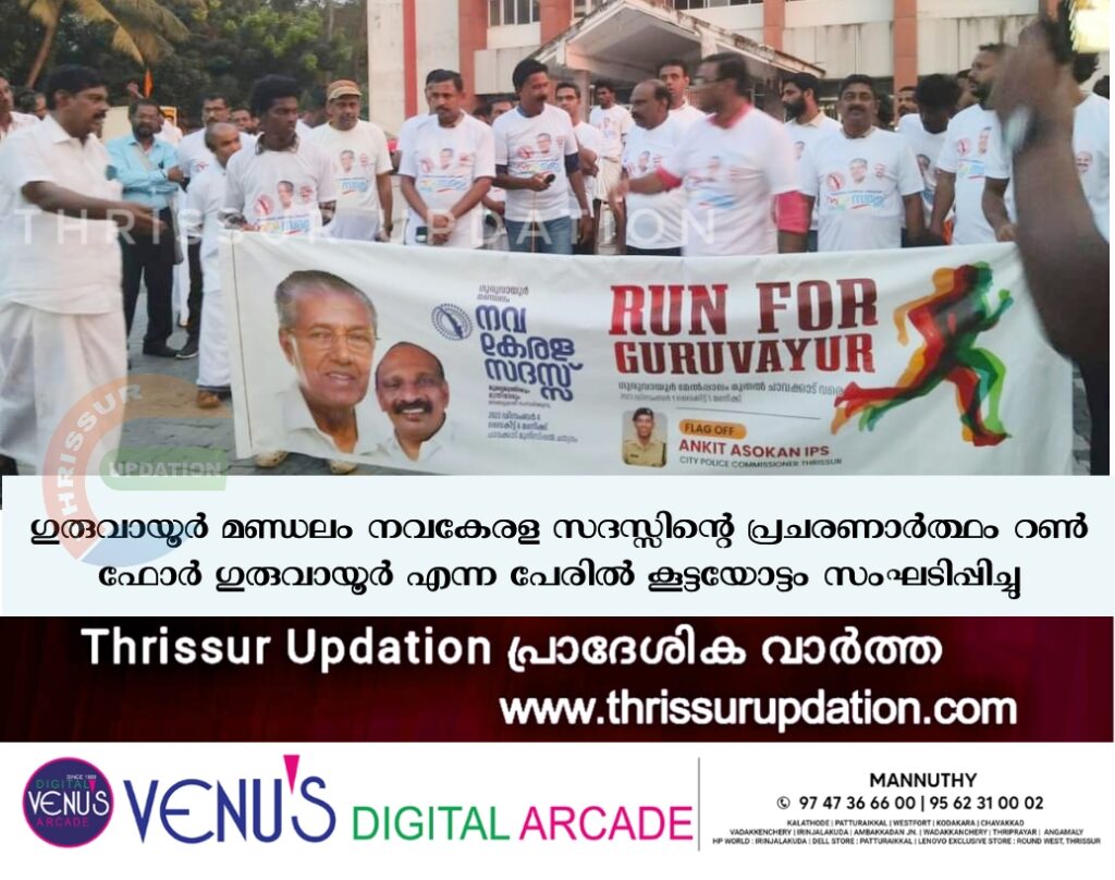 ഗുരുവായൂര് മണ്ഡലം നവകേരള സദസ്സിന്റെ പ്രചരണാര്ത്ഥം റണ് ഫോര് ഗുരുവായൂര് എന്ന പേരില് കൂട്ടയോട്ടം സംഘടിപ്പിച്ചു. ഗുരുവായൂര് മേല്പ്പാലം മുതല് ചാവക്കാട് ഫ്ളോട്ടിങ്ങ് ബ്രിഡ്ജ് വരെയായിരുന്നു കൂട്ടയോട്ടം. എന്.കെ. അക്ബര് എംഎല്എ, ഗുരുവായൂര് നഗരസഭ ചെയര്മാന് എം. കൃഷ്ണദാസ്, ഗുരുവായൂര് എസിപി കെ.ജി. സുരേഷ് എന്നിവര് ചേര്ന്ന് കൂട്ടയോട്ടം ഫ്ളാഗ് ഓഫ് ചെയ്തു.