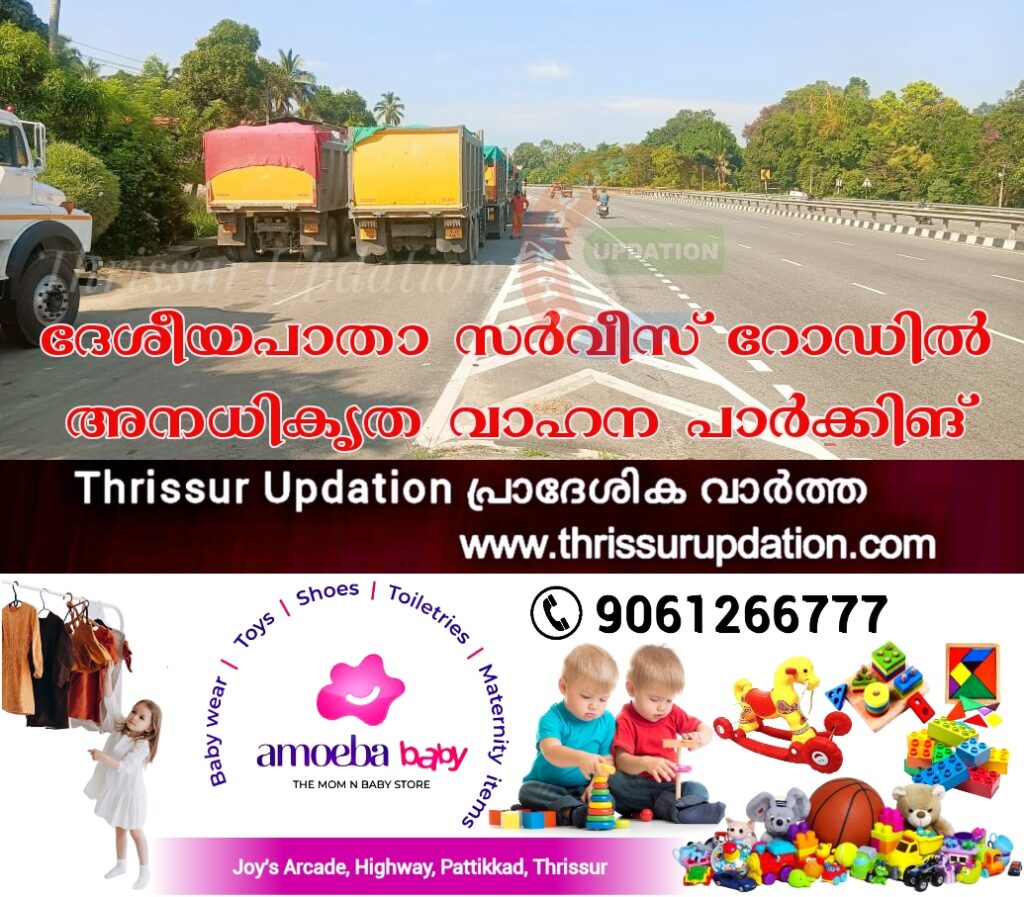 അനധികൃത വാഹന പാർക്കിങ് കാരണം ദേശീയപാതാ സർവീസ് റോഡിലൂടെ സഞ്ചരിക്കാനാവുന്നില്ലെന്നു പരാതി. തോട്ടപ്പടിയിൽ കാർഷിക സർവകലാശാലാ കവാടം, ആറാകല്ല്, മണ്ണുത്തിയിലെ സർവീസ് റോഡ് എന്നിവിടങ്ങളിലാണ് അനധികൃത പാർക്കിങ് നടക്കുന്നത്.ആറാംകല്ലിലും തോട്ടപ്പടിയിലും രാത്രി 7 മുതൽ 10 വരെയാണു സർവീസ് റോഡിലൂടെ നാട്ടുകാർക്കു പ്രവേശിക്കാനാവാത്ത സ്ഥിതിയാണ്. വെളിച്ചക്കുറവുള്ള ഭാഗത്തു നിരനിരയായി ചരക്കു വാഹനങ്ങൾ നിർത്തിയിടുന്നതും പതിവാണ്.