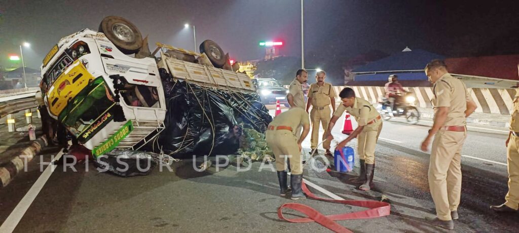 ദേശീയപാത NH 544 മണ്ണൂത്തി വടക്കഞ്ചേരി ആറ് വരിപ്പാതയിൽ മൂവാറ്റുപുഴയിൽ നിന്നും ബാംഗ്ലൂരിലേക്ക് പോകുന്ന പൈനാപ്പിൾ കയറ്റി വന്ന ടെംമ്പോയാണ് പട്ടിക്കാട് മേൽപാലത്തിന് മുകളിൽ മറിഞ്ഞത്.ഡ്രൈവർ കേച്ചേരി സ്വദേശി മനാഫ് പരിക്കേൽക്കാതെ രക്ഷപ്പെട്ടു. അപകടത്തിൽ ആർക്കും പരിക്കില്ല. ഉടൻ തന്നെ ഹൈവേ എമർജൻസി ടീമും പോലീസും ഫയർഫോഴ്സും ഉടൻ എത്തി. ഹൈവേയിൽ വീണ ഡീസൽ സേപ്പും വെള്ളവും ഉപയോഗിച്ച് അഗ്നി രക്ഷാപ്രവർത്തകർ കഴുകി വൃത്തിയാക്കി.ടയർ പൊട്ടിയതിനെ തുടർന്ന് നിയന്ത്രണം വിട്ട ലോറി ദേശീയപാതയിലേക്ക് മറിയുകയായിരുന്നു.സീനിയർ ഫയർ ആൻഡ് റെസ്ക്യൂ ഓഫീസർ ശ്രീറാം കെ. എൽ, ഫയർ ആൻഡ് റെസ്ക്യൂ ഓഫീസർ സന്ദീപ് സി.എസ്, ബിജോയ് ഈനാശു, ഡ്രൈവർ പ്രതീഷ് കുമാർ, ഹോം ഗാർഡ് ബാബു, ഫയർമാൻ ബിബിൻ ബാബു എന്നിവരാണ് അഗ്നി രക്ഷാ സേന സംഘത്തിൽ ഉണ്ടായിരുന്നത്.