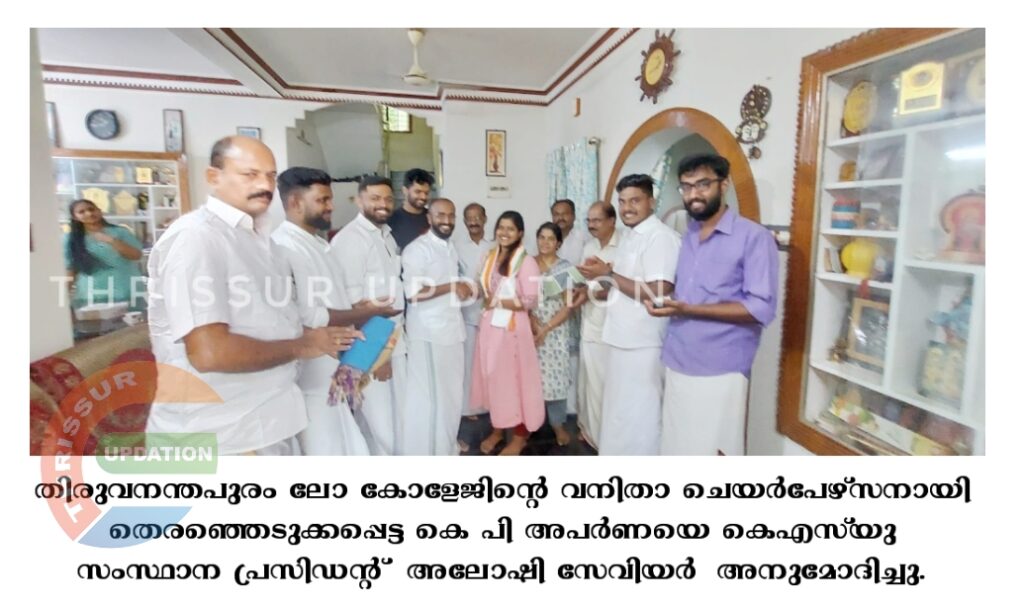 തിരുവനന്തപുരം നിയമ കലാലയത്തിൽ നടന്ന തിരഞ്ഞെടുപ്പിൽ ചരിത്രത്തിലാദ്യമായി വിജയിച്ചു വന്ന വനിതാ ചെയർപേഴ്സൺ ആയ കെഎസ്യു സ്ഥാനാർത്ഥിയായിരുന്ന കെ പി അപർണയെ കെഎസ്യു സംസ്ഥാന പ്രസിഡന്റ് അലോഷി സേവിയർ വസതിയിൽ എത്തി അനുമോദിച്ചു. കോളേജ് ചരിത്രത്തിൽ ആദ്യമായാണ് ഒരു വനിത ചെയർപേഴ്സൺ ആയി തിരഞ്ഞെടുക്കപ്പെടുന്നത്. നിരവധി വർഷങ്ങൾക്കുശേഷമാണ് കെ എസ് യു, കേരള സർവ്വകലാശാലക്ക് കീഴിലുള്ള തിരുവനന്തപുരം ലോ കോളജിൽ കെ എസ് യു വിജയിക്കുന്നത്. നിലവിൽ അഞ്ചാംവർഷ നിയമ ബിരുദ വിദ്യാർത്ഥിയായ കെ പി അപർണ്ണ പട്ടിക്കാട് കമ്പിളി വീട്ടിൽ പ്രസന്നന്റെയും ശ്രീവല്ലിയുടെയും മകളാണ്.കെഎസ്യു സംസ്ഥാന ഭാരവാഹികളായ അനീഷ് ആന്റണി, സച്ചിൻ പ്രദീപ്, മുൻ ബ്ലോക്ക് പ്രസിഡന്റ് കെ സി അഭിലാഷ്, റെജി പി പി, കെ എം പൗലോസ്, യൂത്ത് കോൺഗ്രസ് നേതാവ് ബ്ലസ്സൻ വർഗീസ്, ജെറിൻ തുടങ്ങിയവർ ഒപ്പമുണ്ടായിരുന്നു.