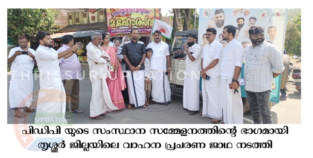 പിഡിപിയുടെ സംസ്ഥാന സമ്മേളനം മലപ്പുറത്ത് ഡിസംബർ 9, 10 , 11 തീയതികളിൽ നടക്കുന്നു. സമ്മേളനത്തിന്റെ ഭാഗമായി കേരളത്തിന്റെ എല്ലാ ജില്ലകളിലും നടക്കുന്ന വാഹന പ്രചരണ ജാഥയുടെ ഭാഗമായി തൃശ്ശൂർ ജില്ലയിലെ വാഹന പ്രചരണ ജാഥ വാണിയംപാറയിൽ നിന്ന് ആരംഭിച്ചു. ജാഥ കെ ഇ അബ്ദുള്ള ഉദ്ഘാടനം ചെയ്തു, പാർട്ടി സംസ്ഥാന ജനറൽ സെക്രട്ടറി ടി. എം. മജീദ് മുഖ്യപ്രഭാഷണം നടത്തി. തൃശ്ശൂർ ജില്ലാ പ്രസിഡൻറ് നൗഷാദ് വാഹനപ്രചരണ ജാഥയുടെ ക്യാപ്റ്റനാരുന്നു. വൈസ് ക്യാപ്റ്റൻ പാർട്ടിയുടെ വനിതാ വിഭാഗമായ വുമൺസ് ഇന്ത്യ മൂവ്മെന്റിന്റെ ജനറൽ സെക്രട്ടറി രാജി മണി. ജെൻസൺ ആലപ്പാട്ടും സ്വാഗതവും മജീദ് മുല്ലക്കര പ്രതിജ്ഞ ചൊല്ലി