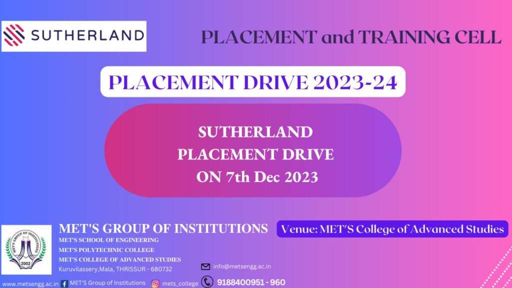 പ്രശസ്ത എം.എൻ.സി. യായ “സതർലാൻഡ്” ലേക്കുള്ള റിക്രൂട്ട്മെൻറ് തൃശ്ശൂർ മാള മെറ്റ്സ് കോളേജ് ഓഫ് അഡ്വാൻസ്ഡ് സ്റ്റഡീസിൽ ഡിസംബർ ഏഴിന് നടക്കുന്നു. ബിരുദാനന്തര ബിരുദം, ബിരുദം, എൻജിനീയറിങ് ഡിപ്ലോമ തുടങ്ങിയവ നേടിയവർക്ക് പങ്കെടുക്കാവുന്നതാണ്. 2024ൽ റിസൾട്ട് പ്രതീക്ഷിക്കുന്നവർക്കും ഇതിൽ പങ്കെടുക്കാവുന്നതാണ്. കൂടാതെ കമ്പ്യൂട്ടർ പരിജ്ഞാനവും ഫിനാൻസ്, അക്കൗണ്ട്സ് എന്നി മേഖലയിലുള്ള അറിവും ഉള്ള വിദ്യാർഥികൾക്ക് ഇതിൽ മുൻഗണനയുണ്ട് . ഇംഗ്ലീഷിൽ സംസാരിക്കുവാനും എഴുതുവാനുമുള്ള നൈപുണ്യം അത്യാവശ്യമാണ്. രാത്രി ഷിഫ്റ്റ് അടക്കമുള്ള സമയക്രമങ്ങൾ അനുസരിച്ച് ജോലി ചെയ്യാൻ സന്നദ്ധത ഉള്ളവർ മാത്രം ഇൻറർവ്യൂവിൽ പങ്കെടുത്താൽ മതി. ഏറ്റവും കുറഞ്ഞ ശമ്പളം ഫ്രഷേഴ്സിന് 2.5 ലക്ഷം രൂപയാണ്. ടെക്നിക്കൽ സപ്പോർട്ട്, കസ്റ്റമർ സപ്പോർട്ട്, ബാക്ക് ഓഫീസ് പ്രോസസ്, ഇൻഷുറൻസ് പ്രോഗ്രാം തുടങ്ങിയ വിഭാഗങ്ങളിലാണ് ഒഴിവുകള് ഉള്ളത്. കൂടുതൽ വിവരങ്ങൾക്ക് പ്ലേസ്മെന്റ് ഓഫീസർ പ്രൊഫ. ജെറിൻ വർഗീസു (മൊബൈൽ നമ്പർ: 9496340361 ) മായി ബന്ധപ്പെടുക.