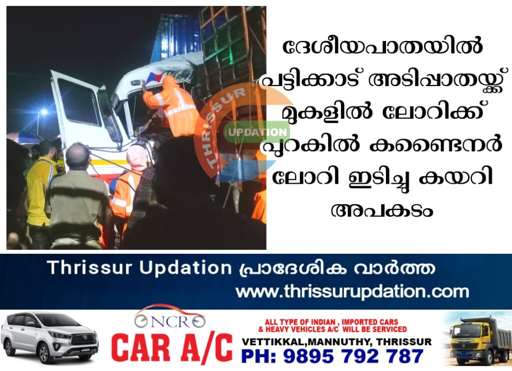 ദേശീയപാതയിൽ പട്ടിക്കാട് അടിപ്പാതയ്ക്ക് മുകളിൽ കണ്ടൈനർ ലോറി നാഷ്ണൽ പെർമിറ്റ് ലോറിക്ക് പുറകിൽ ഇടിച്ചു കയറി. ഡ്രൈവർ പരുക്കുകളോടെ രക്ഷപ്പെട്ടു. തൃശ്ശൂർ നിന്നും പാലക്കാട് പോകുന്ന ട്രാക്കിലാണ് അപകടം ഉണ്ടായത്. സ്ക്രാപ്പ് കയറ്റി പോകുന്ന ലോറിയുടെയും ഗ്യാസ് കയറ്റി പോകുന്ന ലോറിയുടെയും പുറകിൽ കണ്ടൈനർ ലോറി വന്ന് ഇടിക്കുകയായിരുന്നു.