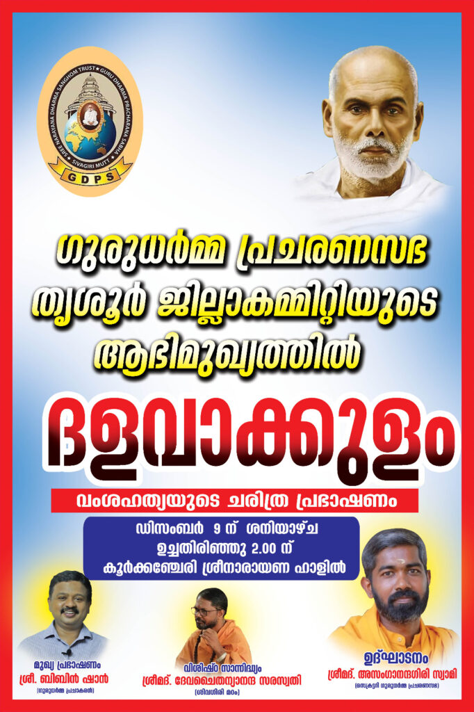 (ശനിയാഴ്ച 2023 ഡിസംബർ 9) ഉച്ചതിരിഞ്ഞ് രണ്ട് മണിക്ക് കൂർക്കഞ്ചേരി എസ് എൻ ബി പി യോഗം ശ്രീമാഹേശ്വര ക്ഷേത്രം ശ്രീനാരായണ ഹാളിൽ, 200 വർഷങ്ങൾക്കു മുമ്പ് കേരളത്തിൽ നിലനിന്നിരുന്ന ജാതിമത ചിന്തകളുടെ ഭാഗമായി നടമാടിയ മൃഗീയമായ അടിമത്തത്തിന്റെ ക്രൂരതകളെ ഇന്ന് കാണുന്ന ദൈവത്തിന്റെ സ്വന്തം നാടാക്കി മാറ്റിയ സാഹചര്യങ്ങളും ചരിത്രതാളുകളിൽ മറയ്ക്കപ്പെട്ട ഭാഗങ്ങളെയും ഉൾക്കൊള്ളിച്ചുകൊണ്ട്, ഗുരുദേവ ദർശനത്തിന്റെ പ്രാധാന്യം മനുഷ്യഹൃദയത്തിലേക്ക് എത്തിച്ച്, മാനവ രാശിയുടെ പുരോഗതിക്ക് വേണ്ടി ജാതിമത വർഗ്ഗ വ്യത്യാസമില്ലാതെ ഭാരതത്തെ എങ്ങിനെ ഈ നൂറ്റാണ്ടിൽ മുന്നോട്ടു കൊണ്ടുപോകാം എന്ന് ഗുരുദേവ സൂക്തങ്ങളെയും കൃതികളെയും ആസ്പദമാക്കി കുറഞ്ഞ സമയം കൊണ്ട് സംസാരിക്കുവാൻ, ഗുരുധർമ്മ പ്രചാരകനായ ബിബിൻ ഷാൻ മുഖ്യപ്രഭാഷകനായി പങ്കെടുക്കുന്നു. കൂർക്കഞ്ചേരി ശ്രീ മാഹേശ്വര ക്ഷേത്രം ഹാളിൽ നിങ്ങൾ ഓരോ വ്യക്തികളും, സുഹൃത്തുക്കളും, കുടുംബ അംഗങ്ങളോടൊത്ത് പങ്കെടുക്കാവുന്നതാണ്. ഔപചാരികമായ ഉദ്ഘാടന കർമ്മം ഗുരുധർമ്മ പ്രചരണ സഭ സെക്രട്ടറി ശ്രീമദ് അസംഗാനന്ദഗിരി സ്വാമികൾ നിർവഹിക്കുന്നു. സാമിയോടൊപ്പം ശ്രീമദ് ദേവ ചൈതന്യാനന്ദ സ്വരസ്വതി സ്വാമികളുടെ സാന്നിധ്യം ഉണ്ടാവുന്നതാണെന്ന് ഗുരുധർമ്മ പ്രചരണ സഭയ്ക്കു വേണ്ടി തൃശ്ശൂർ ജില്ലാ സെക്രട്ടറി കെ യു വേണുഗോപാലൻ അറിയിച്ചു