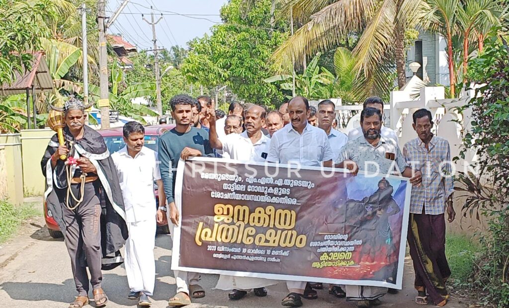 തൃശൂർ കോർപ്പറേഷൻ മേയറുടെയും, തൃശൂർ എം.എൽ.എ.യുടെയും നാട്ടിൽ സഞ്ചാരയോഗ്യമായ റോഡിന് വേണ്ടി വ്യത്യസ്തങ്ങളായ പ്രതിഷേധങ്ങൾ സംഘടിപ്പിച്ചിട്ടും, അധികാരികളെ രേഖാമൂലവും, പത്രമാധ്യമങ്ങൾ വഴിയും അറിയിച്ചിട്ടും അനങ്ങാത്ത ഭരണാധികാരികൾക്കെതിരെ വീണ്ടും ജനകീയ പ്രതിഷേധം ശക്തമാകുന്നു. ആദ്യം കുഴി എണ്ണി തിട്ടപ്പെടുത്തിയവർക്ക് പൊൻപണം നൽകുകയും, പിന്നീട് പാസാക്കിയ പണം കൊണ്ട് നിർമ്മിച്ച റോഡ് കാണുന്നതിനും, കുഴികൾ വ്യക്തമായി കണ്ട് വാഹനം ഓടിക്കുന്നതിനും വേണ്ടി ധൂർത്തിന്റെ പ്രതീകം കൂടിയായ കണ്ണടകൾ നൽകുകയും ചെയ്തു. എന്നിട്ടും അനങ്ങാത്ത ഭരണാധികൾക്കെതിരെ തളരാത്ത പോരാട്ടവുമായി നാട്ടുകാർ മുന്നോട്ട് പോകുന്നു. അതിന്റെ ഭാഗമായി റോഡിന്റെ ശോചനീയാവസ്ഥയിൽ പതിയിരിക്കുകയും, ജനങ്ങൾ റോഡിൽ വീഴുമ്പോൾ അട്ടഹസിക്കുകയും ചെയ്യുന്ന കാലനെ പ്രതീകാത്മകമായി ആട്ടിയോടിക്കുന്ന സമരം സംഘടിപ്പിച്ചു.
